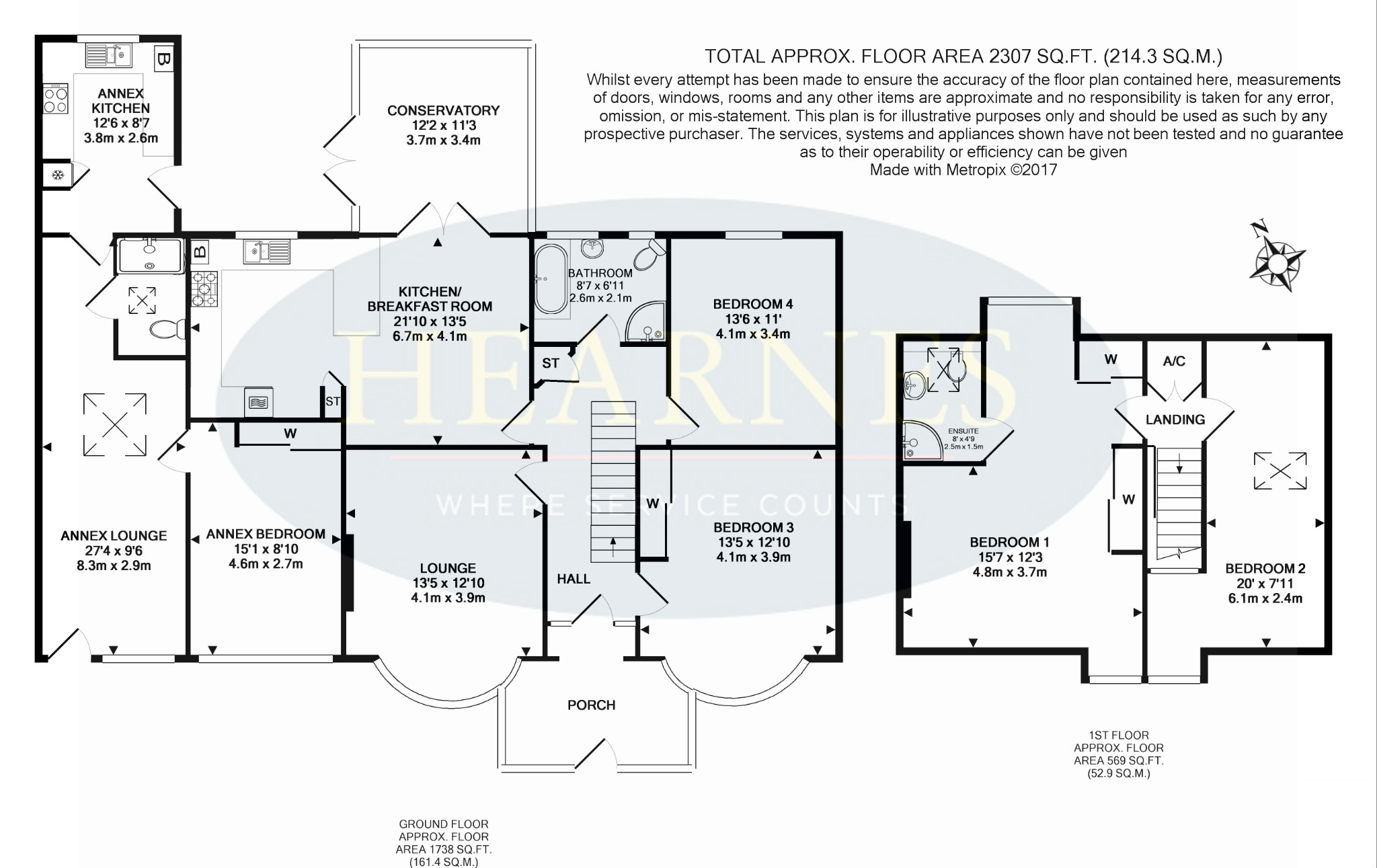 This 2,300sq ft extremely light, spacious and versatile 1930’s bungalow has been substantially enlarged to create a one bedroom self-contained annexe, which has its own private entrance. The plot is also a particular feature, as the rear garden measures approximately 160’ in length whilst the front driveway provides generous off road parking for several vehicles. • Large entrance porch • Entrance hall with stairs rising to the first floor and coat cupboard • 13’ lounge with a bay window overlooking the front garden and a feature fireplace creating an attractive focal of the room • 21’ kitchen/breakfast/dining room • The kitchen/breakfast area incorporates ample roll top work surfaces which continues around to form a breakfast bar, good range of base and wall units, integrated five ring gas hob with extractor canopy above, oven, grill, recess and plumbing for dishwasher and washing machine, space for fridge/freezer, cupboard housing wall mounted gas fired boiler, tiled floor and window overlooking the rear garden • The dining area has ample space for a large dining table and chairs, a tiled floor and French doors leading out to the conservatory • 12’ conservatory with tiled floor and French doors leading out into the garden • Bedroom three is a generous size double benefitting from a fitted wardrobe • Bedroom four is also a generous size double bedroom • Family bathroom/shower room finished in a stylish white suite incorporating a panel bath, separate shower cubicle, WC, pedestal wash hand basin, fully tiled walls • First floor landing with linen cupboard • Bedroom one is an extremely spacious and dual aspect master bedroom, benefitting from fitted wardrobes and a door which gives access into a walk in loft storage space • En-suite shower room finished in a stylish white suite incorporating a corner shower cubicle, chrome raindrop shower head with separate shower attachment, WC with concealed cistern, wall mounted wash hand basin, fully tiled walls • Bedroom two is a large 20’ double bedroom enjoying a dual aspect with fitted wardrobes and access into the eaves for useful storage • The annexe has its own private entrance into a large porch • Annexe lounge/dining room • Annexe double bedroom with fitted wardrobes • Annexe shower room finished in a stylish white suite incorporating a large shower area, pedestal wash hand basin, WC, fully tiled walls and flooring • Annexe kitchen incorporating roll top work surfaces, base and wall units, integrated oven, recess for microwave, fridge/freezer, recess and plumbing for washing machine and space for tumble dryer, wall mounted gas fired boiler, window overlooking the rear garden, door leading out onto the patio area Outside The rear garden is a superb feature of the property as it measures approximately 160’ x 60’ and is fully enclosed by mature shrubs and fencing. Adjacent to the rear of the property there is a large Indian Sandstone paved patio which continues down to join a large expanse of well-kept lawn. Halfway down the garden there is a brick-built outbuilding which is currently used as a garden store, whilst at the far end of the garden there is a greenhouse/potting shed. The garden itself must be seen to be fully appreciated. The front driveway provides generous off-road parking for several vehicles. Further benefits include double glazing and two separate gas fired heating systems for the main house and the annexe. Both the market town of Wimborne and Ferndown’s town centre are located approximately 3½ miles away COUNCIL TAX BAND: E EPC RATING: DAGENTS NOTES: The heating system, mains and appliances have not been tested by Hearnes Estate Agents. Any areas, measurements or distances are approximate. The text, photographs and plans are for guidance only and are not necessarily comprehensive. Whilst reasonable endeavours have been made to ensure that the information in our sales particulars are as accurate as possible, this information has been provided for us by the seller and is not guaranteed. Any intending buyer should not rely on the information we have supplied and should satisfy themselves by inspection, searches, enquiries and survey as to the correctness of each statement before making a financial or legal commitment. We have not checked the legal documentation to verify the legal status, including the leased term and ground rent and escalation of ground rent of the property (where applicable). A buyer must not rely upon the information provided until it has been verified by their own solicitors.