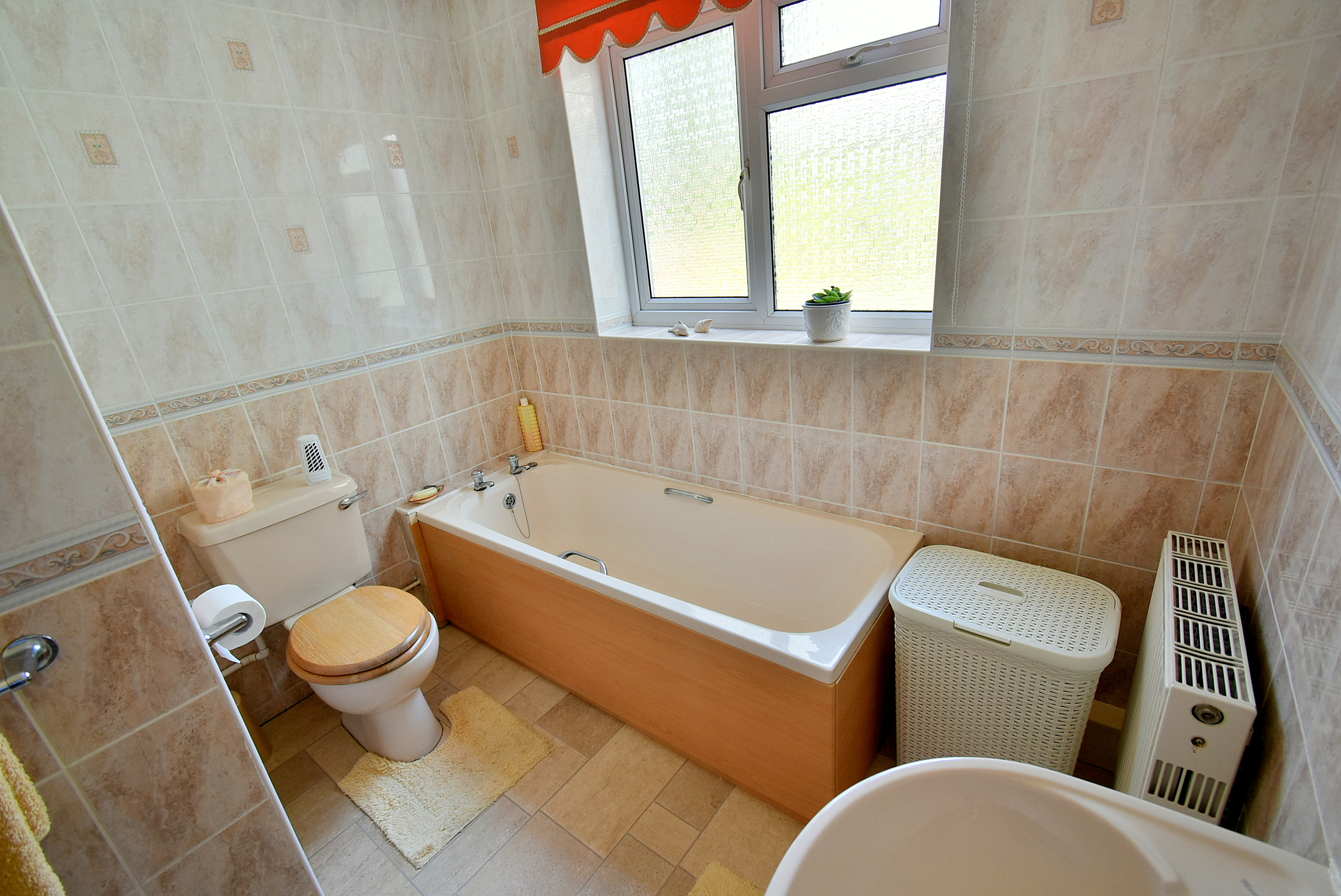 • Bathroom, incorporating a panel bath, WC, pedestal wash hand basin and fully tiled walls