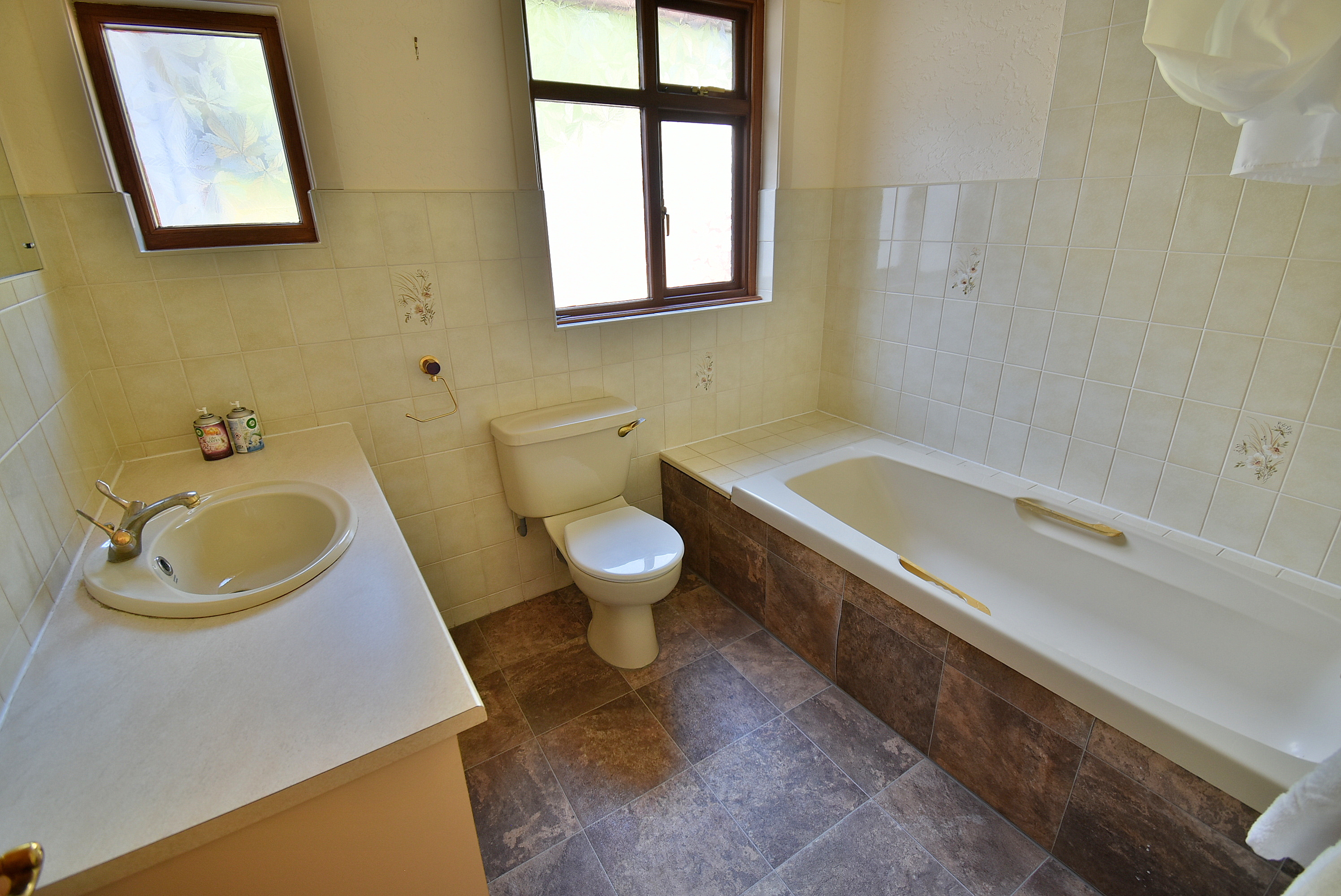 • Family bathroom, incorporating a panelled bath with mixer taps and shower hose, wash hand basin with vanity storage beneath, WC, partly tiled walls