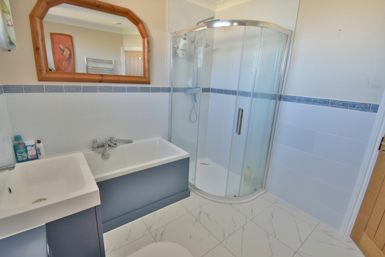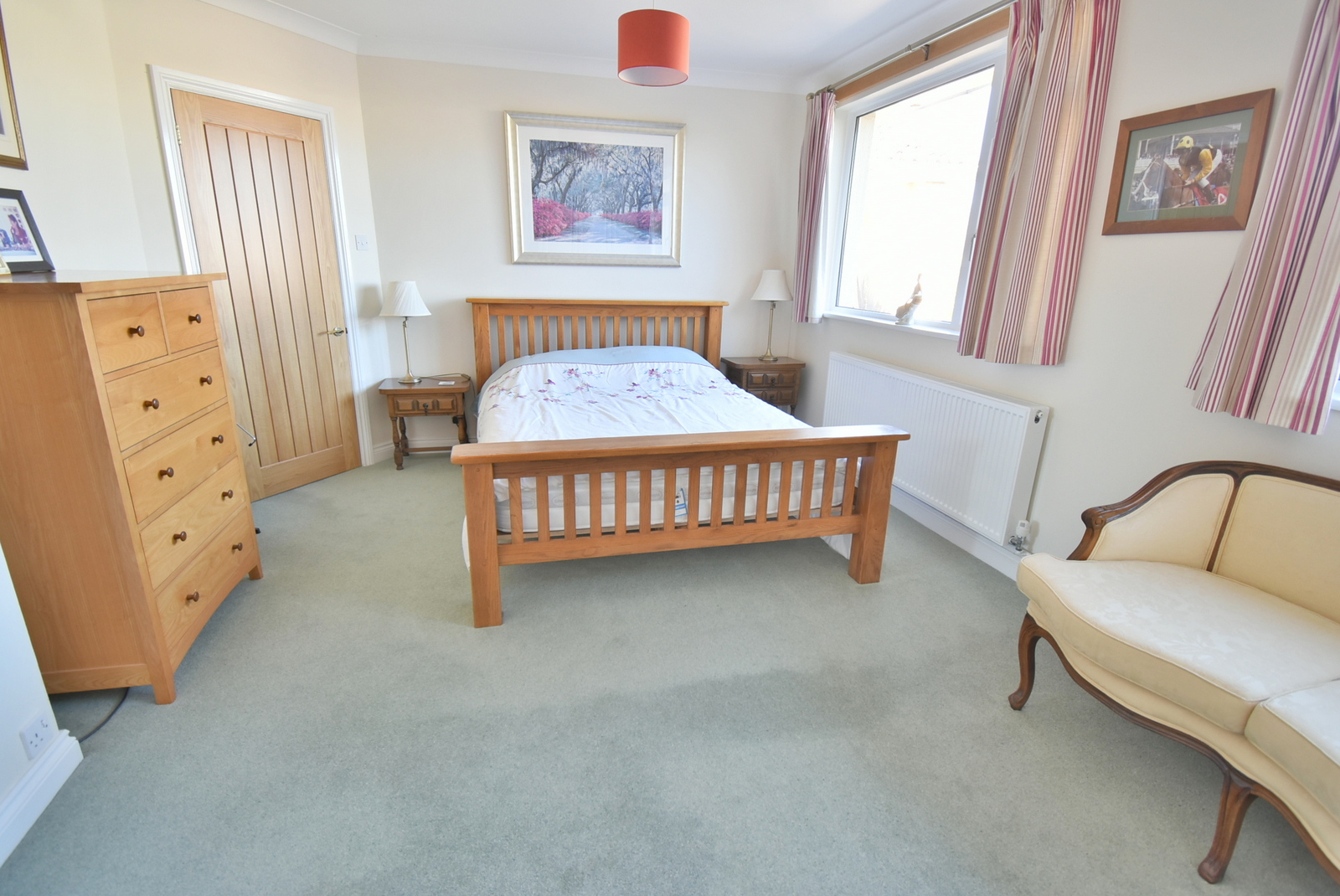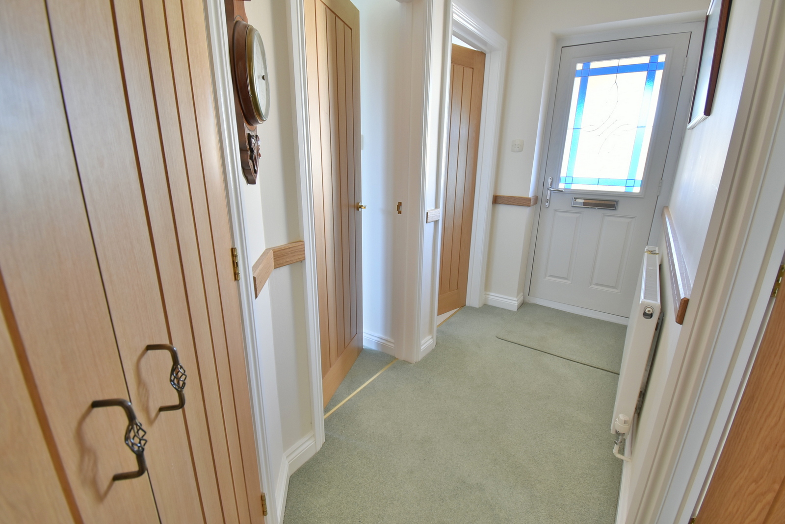 • Entrance hall – Hatch to loft access with pull down ladder, attractive solid oak doors with matching decorative central wooden rail and double doors to an airing cupboard housing a modern hot water tank, pressurised cylinder and wooden slatted shelving