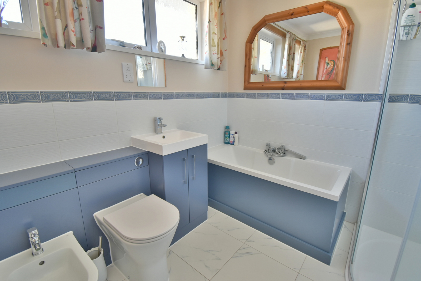 • Family bathroom – stylish modern matching suite comprising panelled bath with central mixer tap, vanity unit with monobloc basin, inset WC and bidet and a separate 1 ½ size walk in shower cubicle with chrome fitted shower and overhead rainfall shower unit, windows to the front aspect, heated towel radiator, partial tiled walls and fully tiled flooring