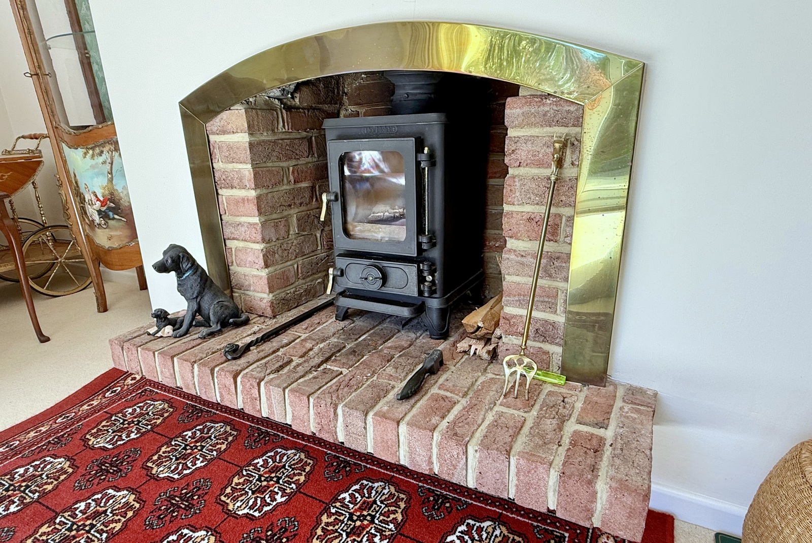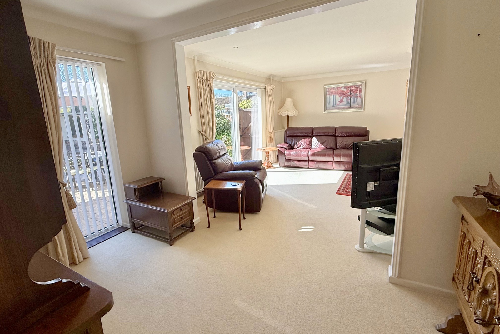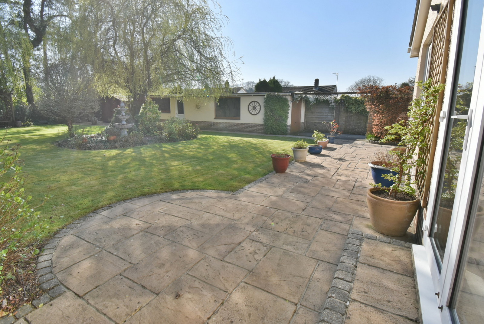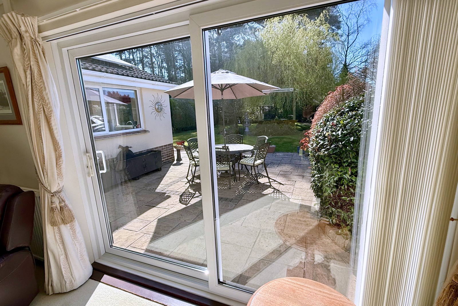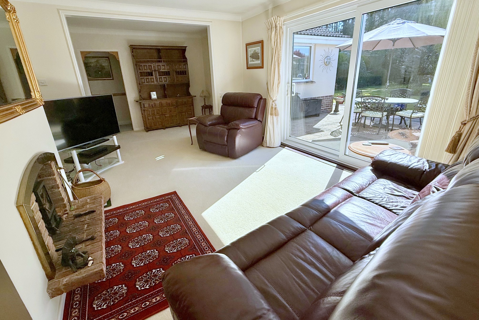 • Living room – Spacious light and airy south facing room with sliding patio doors giving access to and overlooking the landscaped rear garden, feature centrally positioned brick raised plinth and open fireplace with inset wood burner, further versatile space with floor to ceiling double glazed window