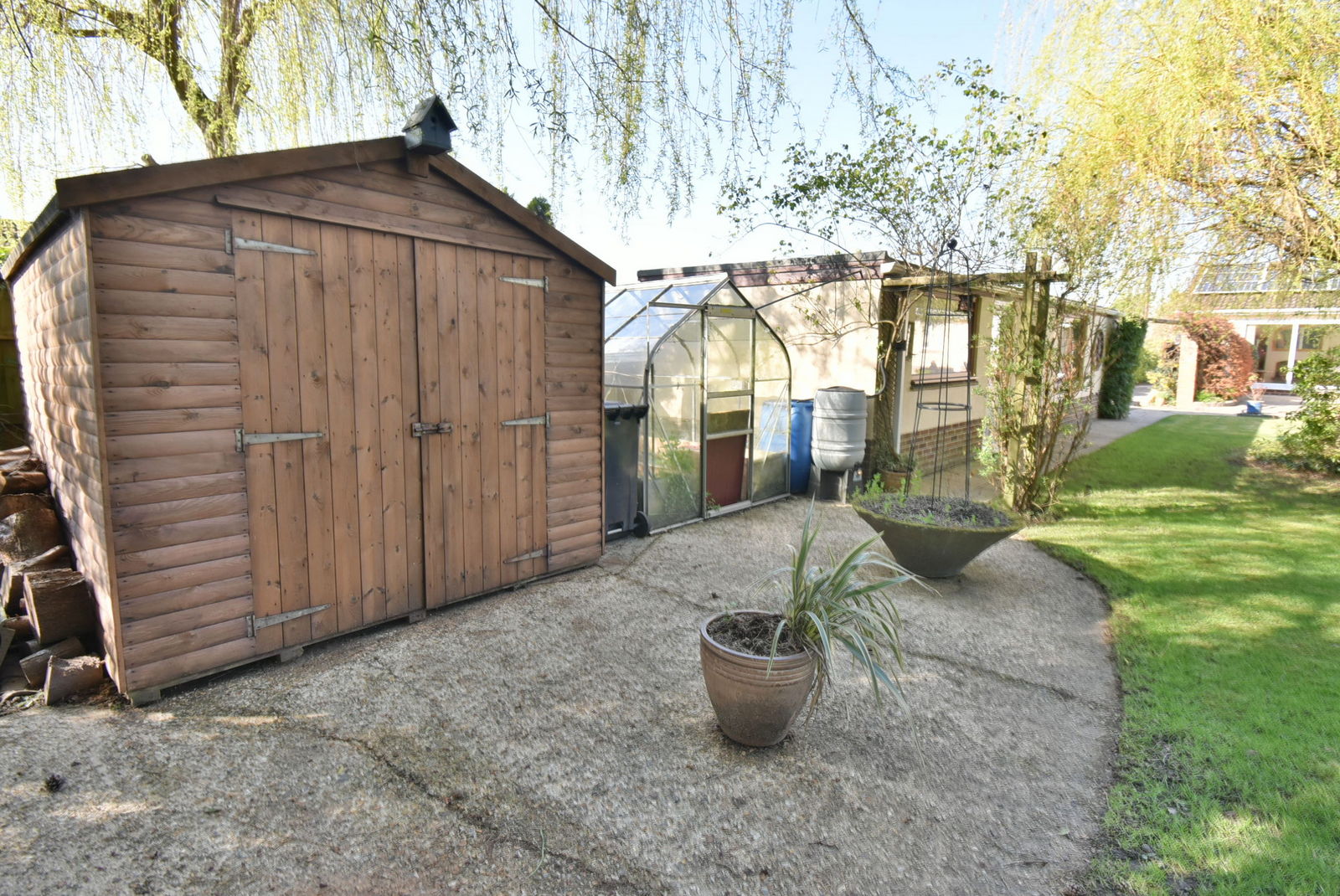 • Rear garden measuring approximately 91ft x 55ft. This splendid mature landscaped garden blends into a wooded backdrop to provide excellent seclusion and privacy, with a southerly aspect. The main garden is laid to lawn with various shrub and flower borders and two sections of patio enclosed by mature hedging with timber shed, greenhouse and potting area.