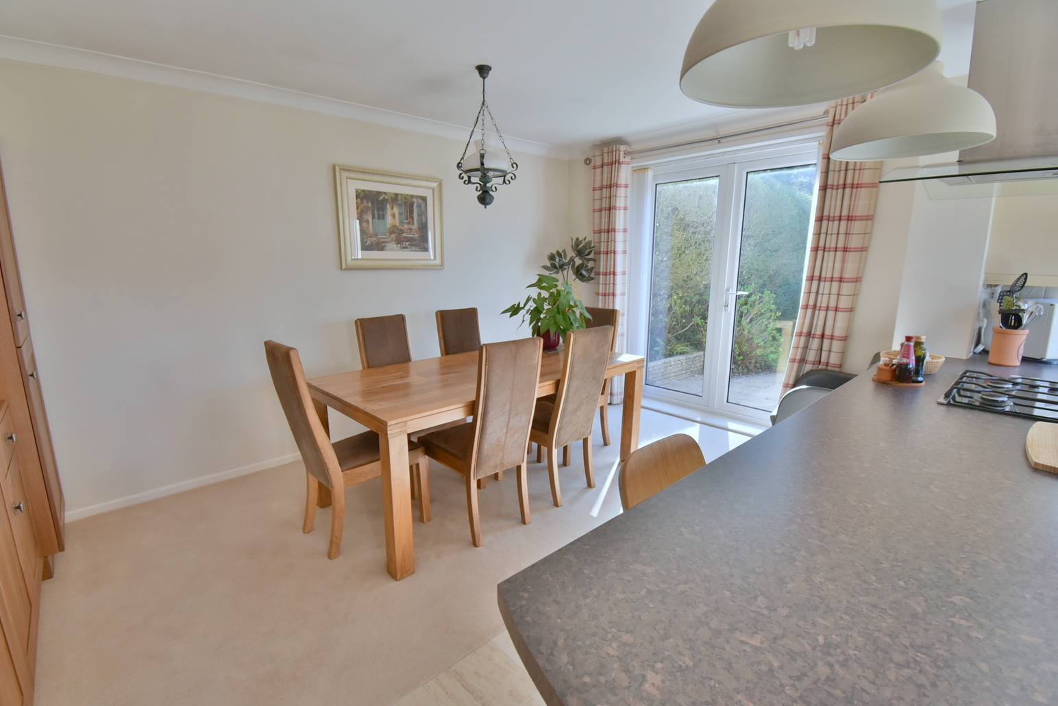 • Dining area - further fitted units and integrated and concealed fridge/freezer. This area provides space for a family dining table and chairs, with French doors providing views across and access out to the landscaped garden