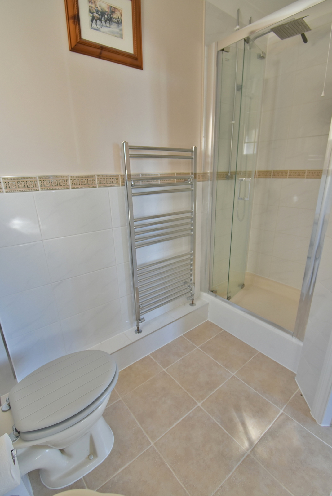 • En-suite shower room – Modern matching suite incorporating a recessed shower cubicle, tiled splashbacks and chrome fitted shower unit with overhead rainfall shower, extractor fan and concertina style glass door, low level WC, wash hand basin, tiled flooring, further tiling to half height, a window to the side aspect and a chrome heated towel rail