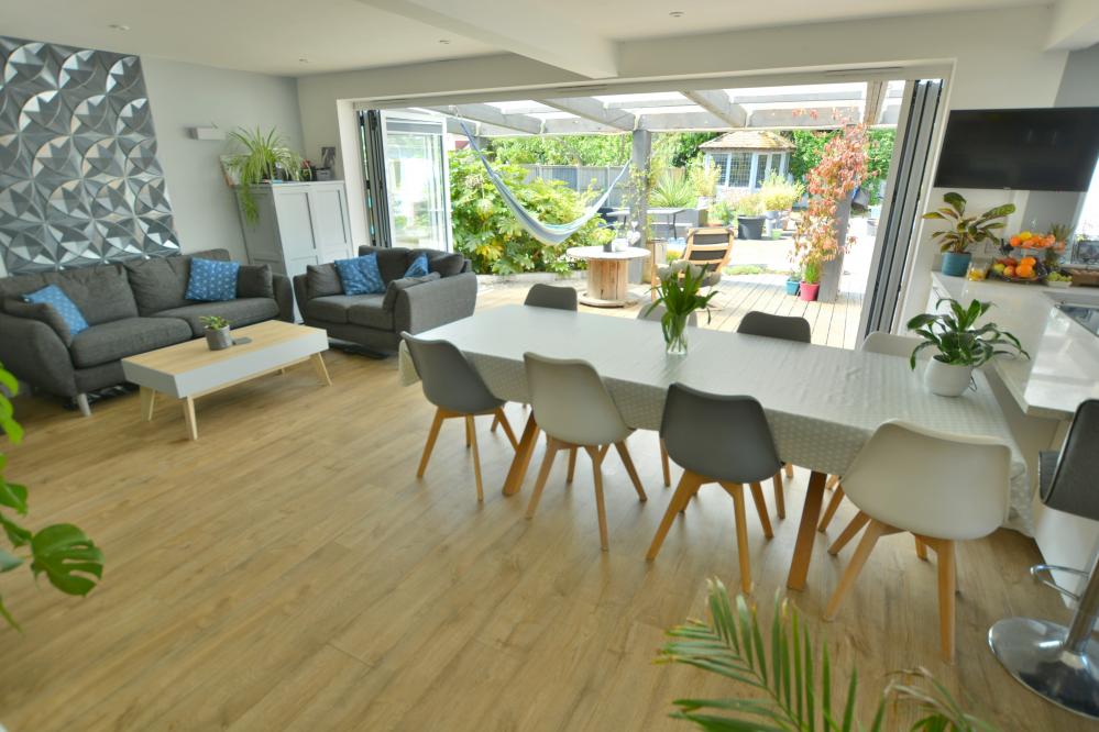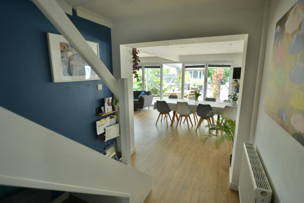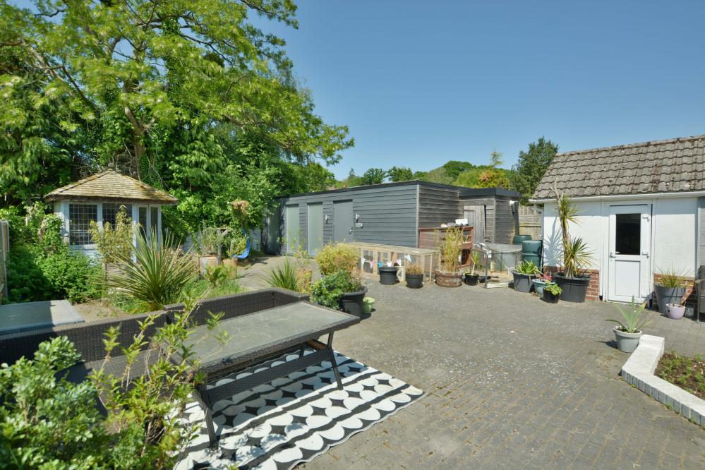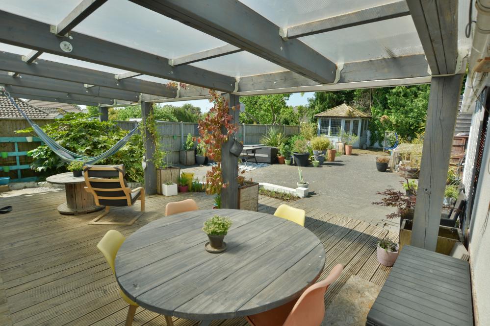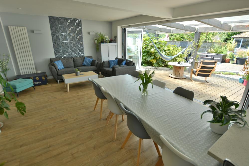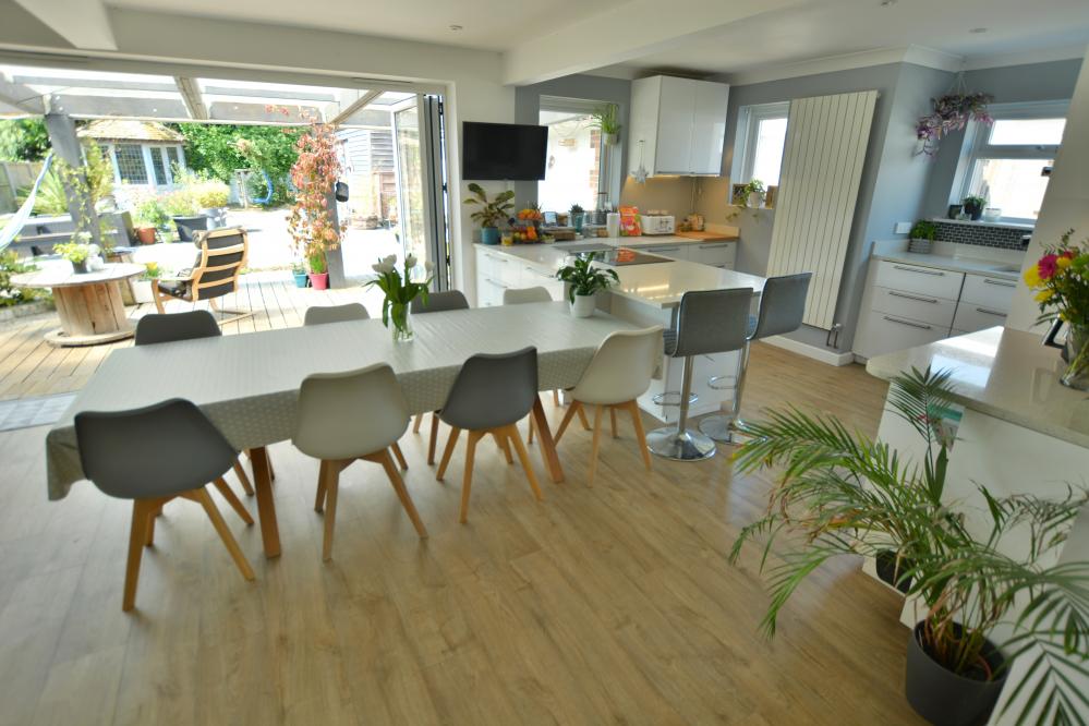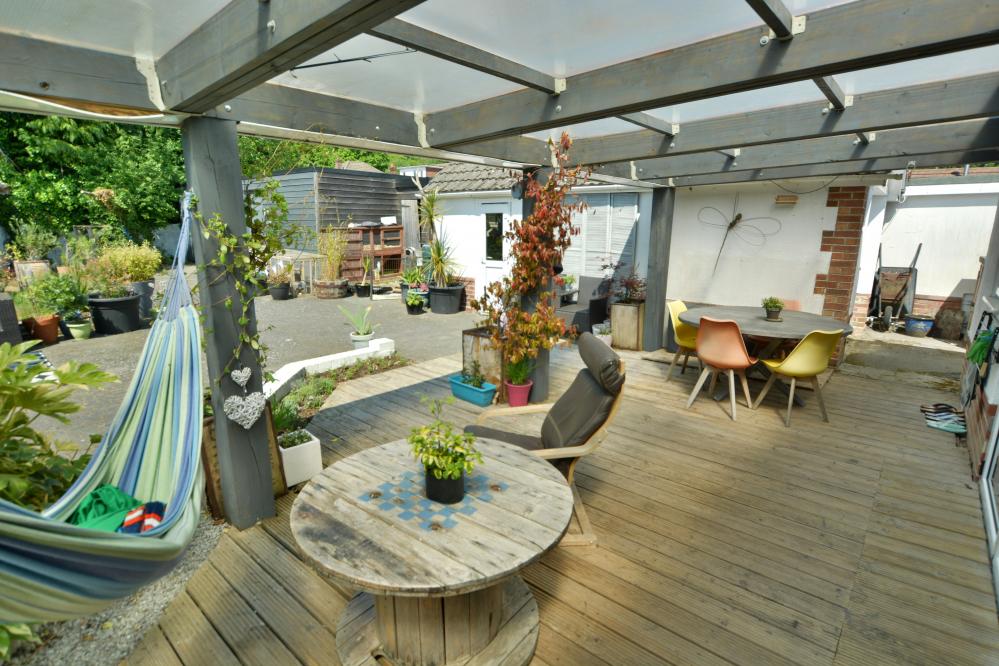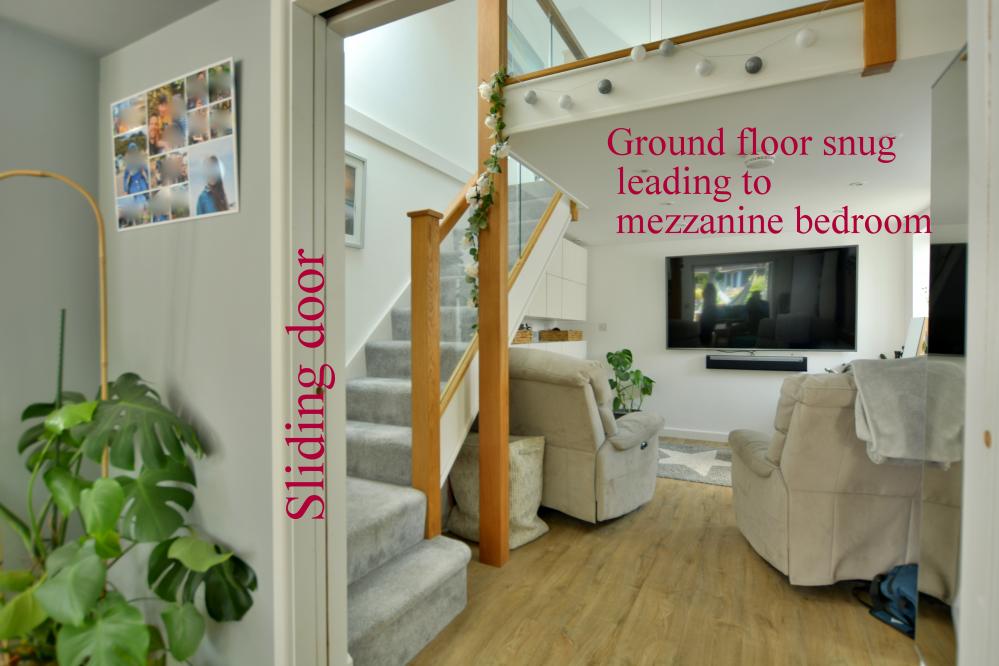 A well presented detached family home (currently adapted for a disabled person) offering three/four bedrooms as well as a stunning kitchen/lifestyle room, separate utility room and studio with ample off road parking situated in a sought after location. • Large entrance hallway with storage cupboard and space for cloaks and shoes • Stunning open plan kitchen/dining//lifestyle room. Kitchen with range of drawers and eye level cupboards with quartz worktops and breakfast bar, inset induction hob with adjacent oven and grill, integrated dishwasher and fridges, space for table and chairs and sofa with bifold doors leading to covered pergola and garden, pocket doors leading to snug • Ground floor snug with stairs to mezzanine bedroom with Velux windows • Separate utility room with units, sink and space for washing machine and freezer • Study with fitted shutters and front aspect • Bedroom 1 & 2 - 21’9” x 11’5” - easily converted back into two rooms with shutters and black out blinds enjoying a front aspect • Bedroom 3/4 – bedroom three with first floor can be converted to provide two bedrooms • Large shower room currently adapted for a disabled person, wash hand basin, WC, ladder style heated towel rail and wet room • Double glazing, gas heating and Quick-Step wood effect flooring on most of the ground floor • Outside: Ample off road parking for numerous vehicles. The rear garden has a storage garage. To the immediate rear there is a large decking area with covered pergola ideal for al fresco dining. The garden then has a brick paviour patio and small wildflower bed. To the rear a summer house and superb studio which did house a hydro pool currently covered and with shower, wash hand basin and WC The location of the property combines the advantage of town with easy access to open countryside and the river Stour nearby. Wimborne town centre is just over a mile where there are a number of shops, restaurants, public houses and the popular Tivoli theatre. COUNCIL TAX BAND: E EPC RATING: CAGENTS NOTES: AGENTS NOTES: The heating system, mains and appliances have not been tested by Hearnes Estate Agents. Any areas, measurements or distances are approximate. The text, photographs and plans are for guidance only and are not necessarily comprehensive. Whilst reasonable endeavours have been made to ensure that the information in our sales particulars are as accurate as possible, this information has been provided for us by the seller and is not guaranteed. Any intending buyer should not rely on the information we have supplied and should satisfy themselves by inspection, searches, enquiries and survey as to the correctness of each statement before making a financial or legal commitment. We have not checked the legal documentation to verify the legal status, including the leased term and ground rent and escalation of ground rent of the property (where applicable). A buyer must not rely upon the information provided until it has been verified by their own solicitors.