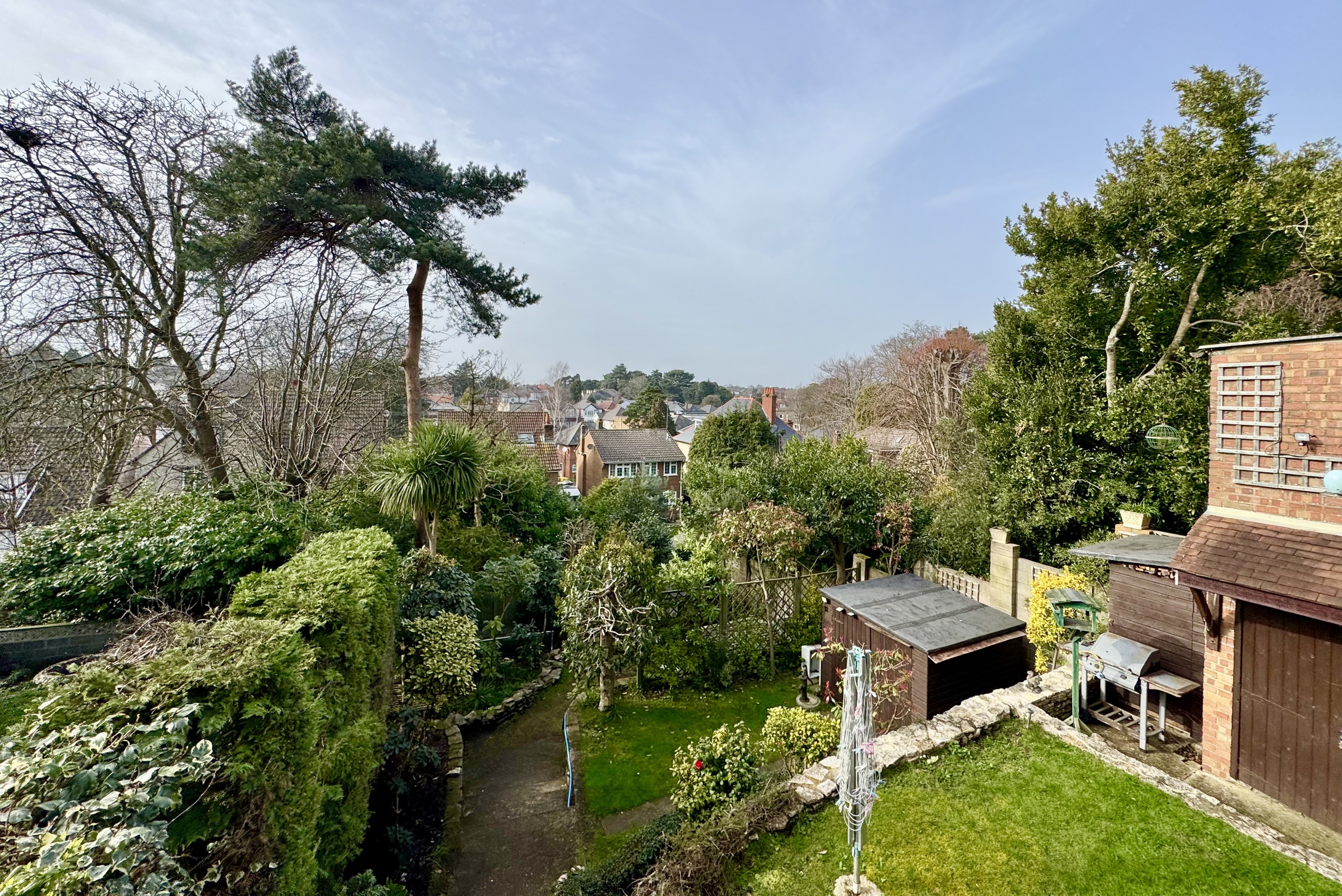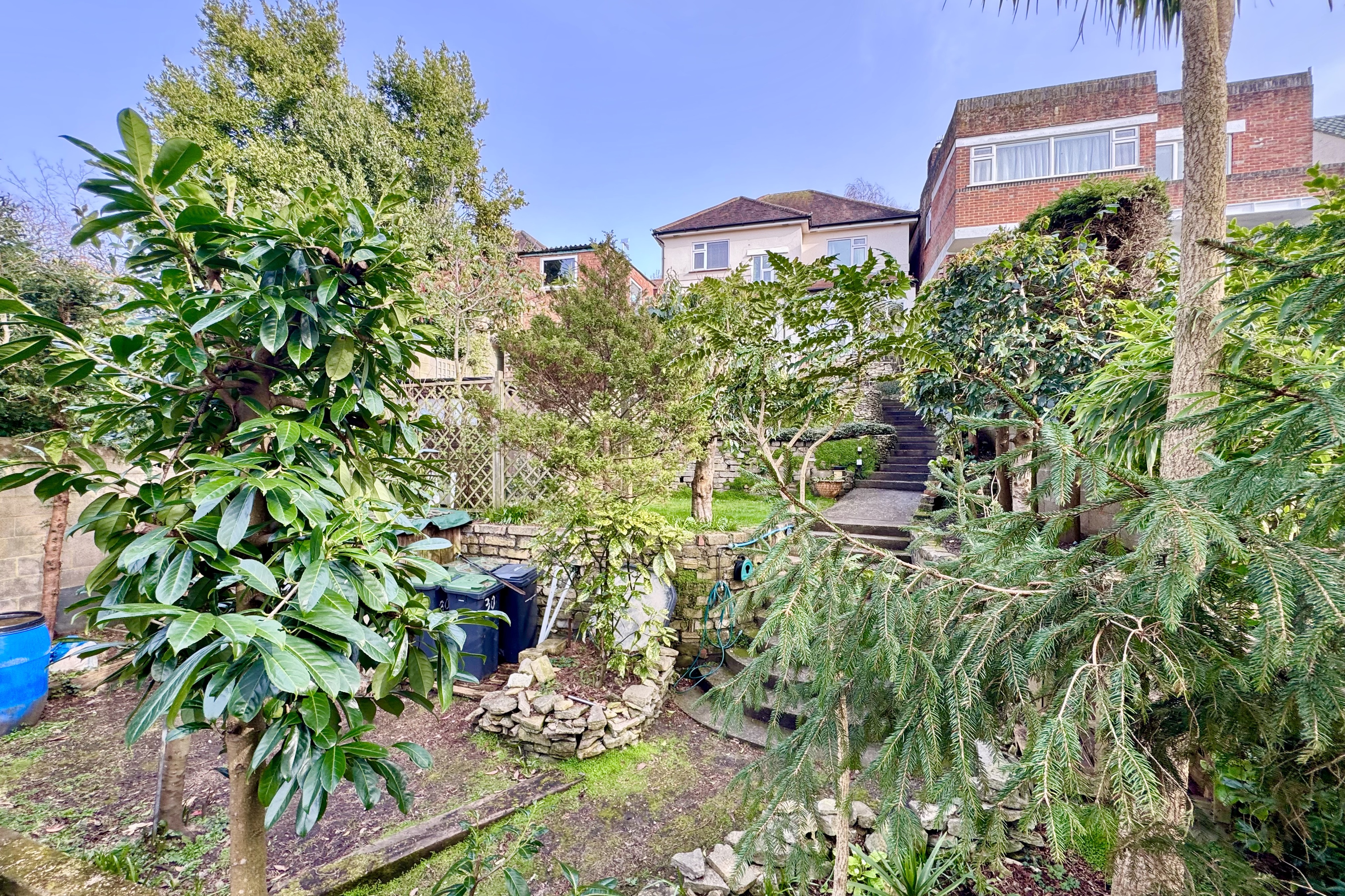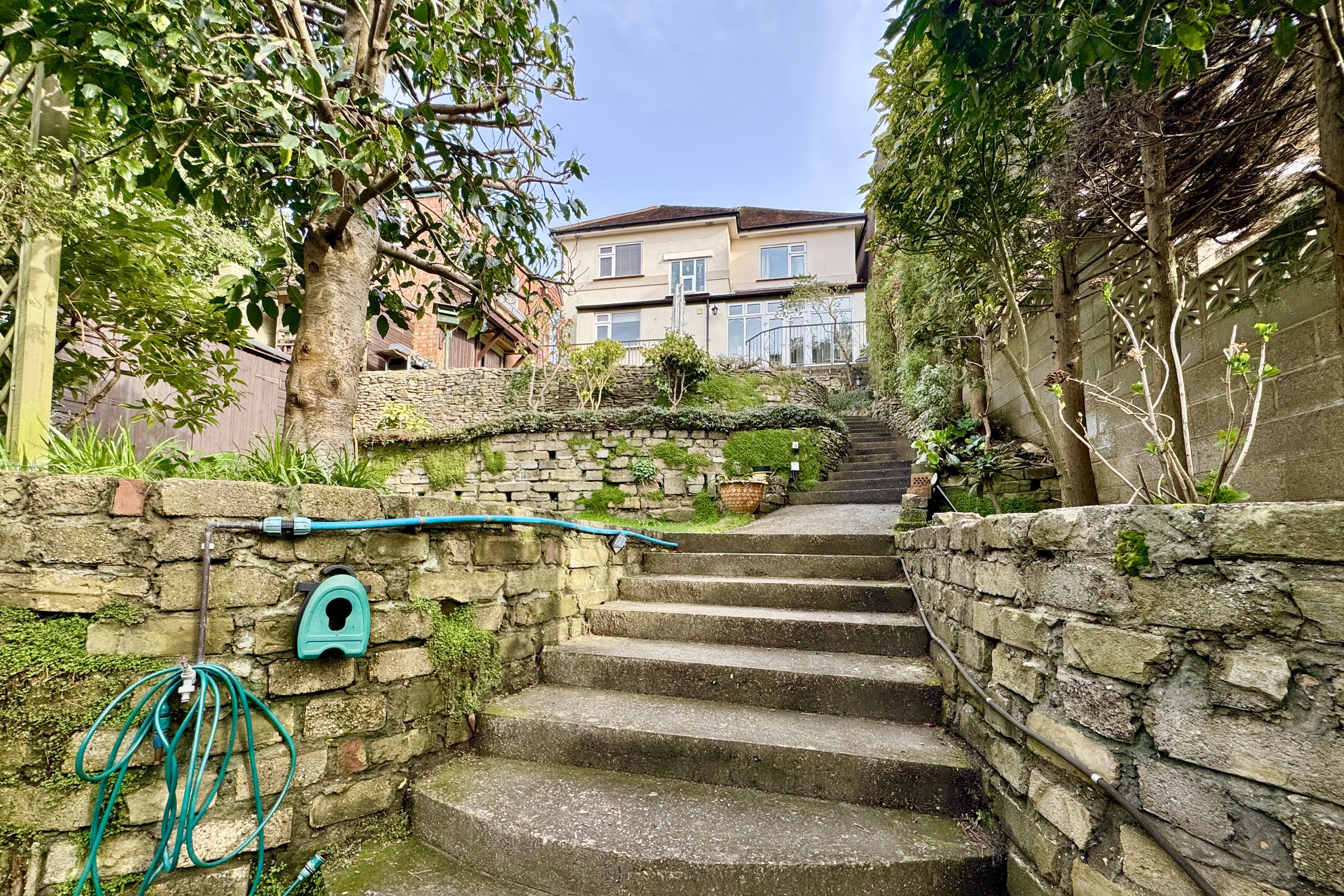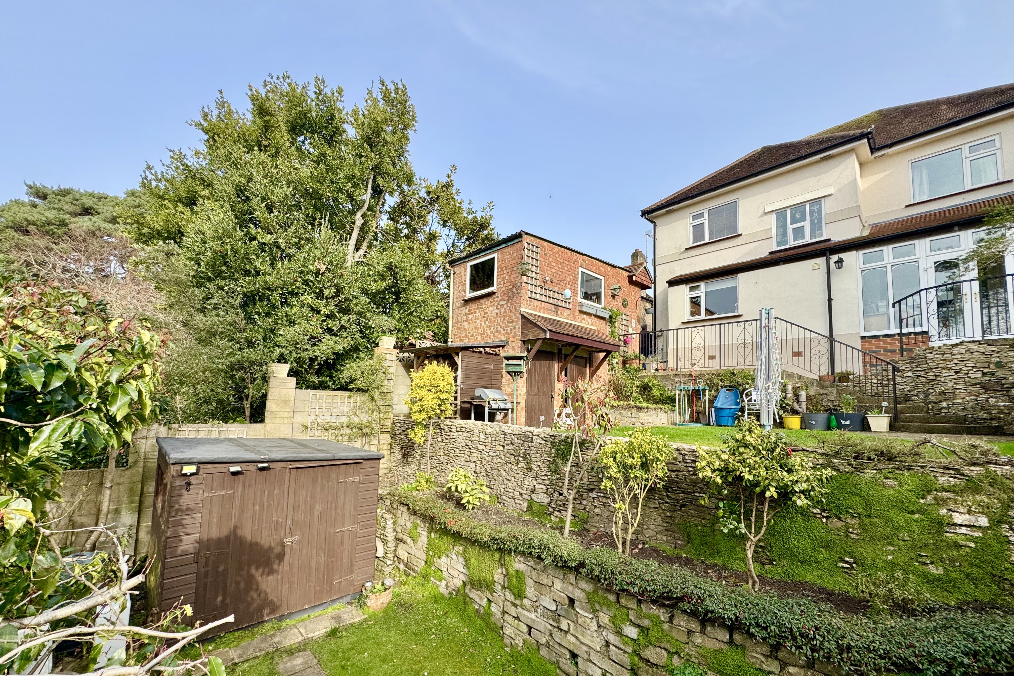To the front, the garden is mainly laid to lawn with mature shrubs and a driveway providing off-road parking. A side gate leads to the rear westerly-facing garden with rooftop views from the terrace. The stepped garden offers areas of lawn and mature planting providing good seclusion. There is a impressive workshop/garage with power and light, two storage sheds below, and two further good-sized garden sheds.