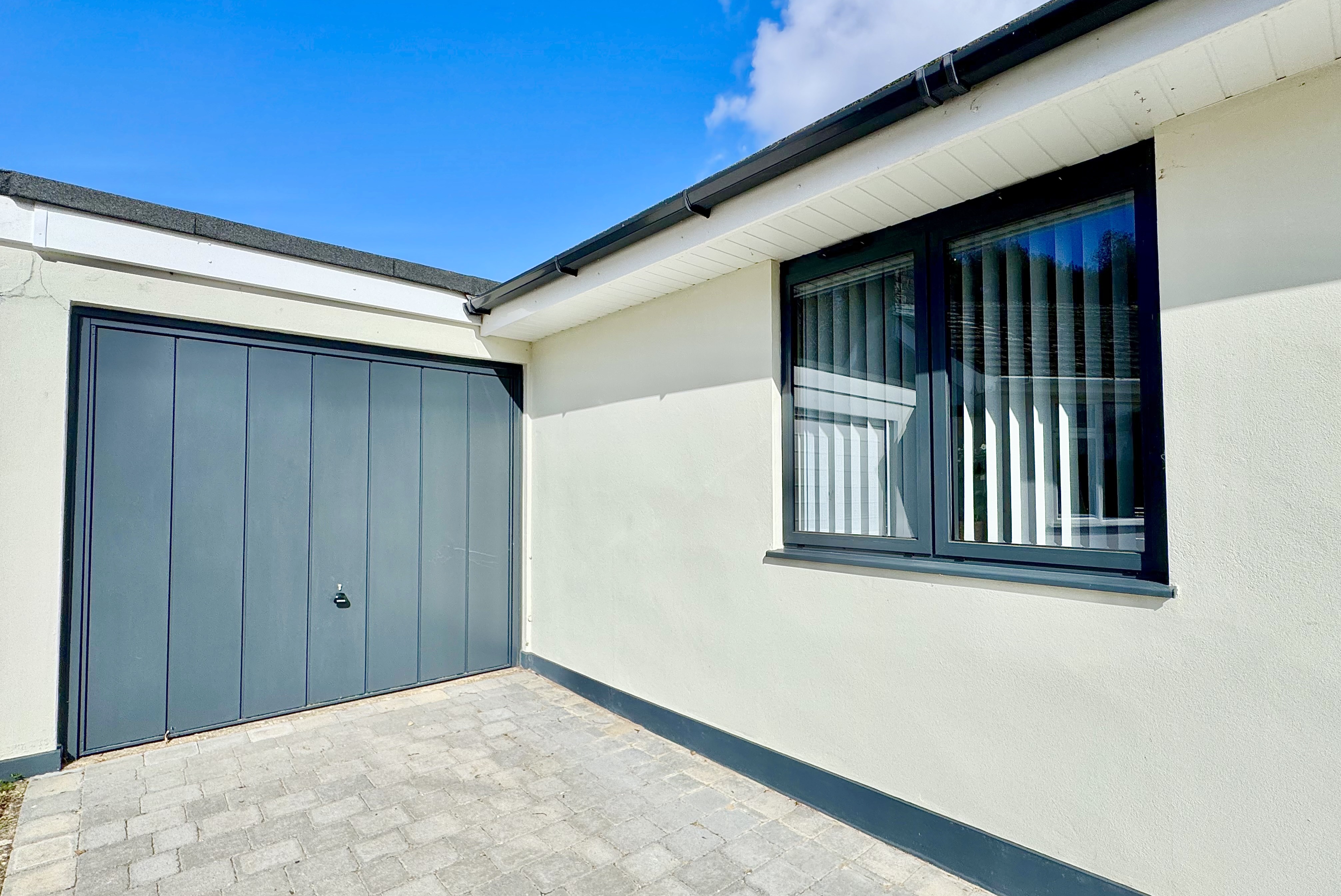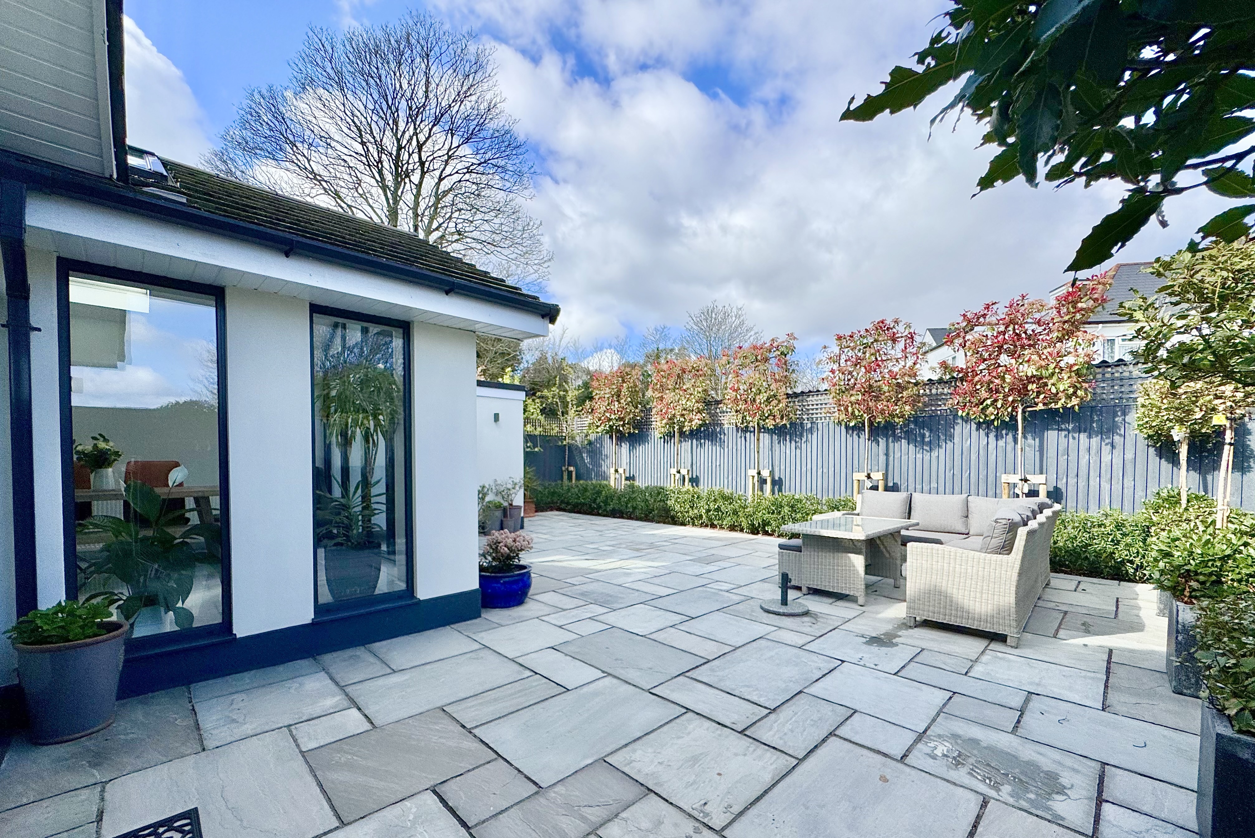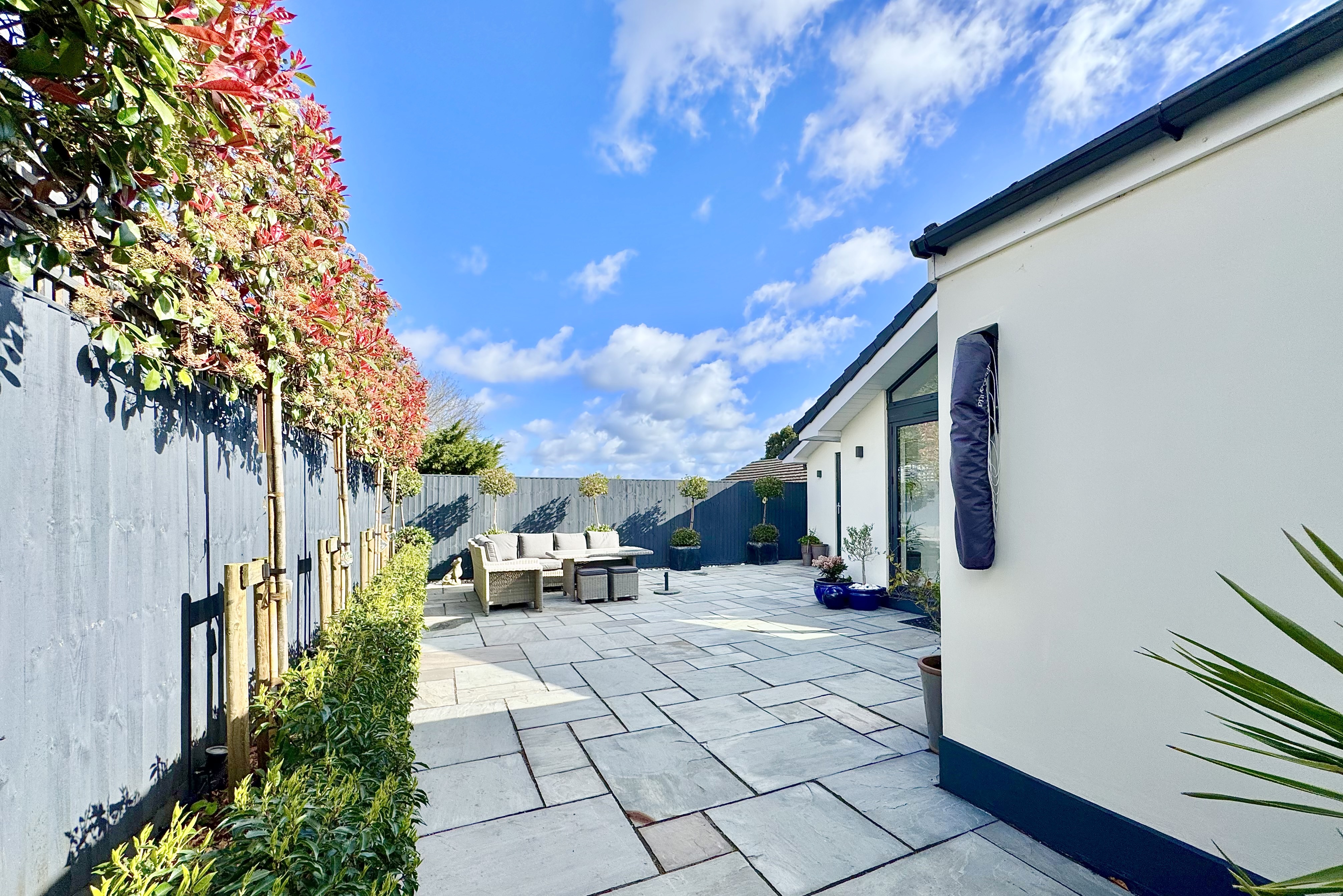 Externally, the property is superbly presented, with a newly installed tegula block paved driveway providing ample off-road parking and a striking contemporary Palladio entrance door with glazed side panel. The south-facing rear garden offers a private, low-maintenance space ideal for seating and entertaining, complemented by uplighters to illuminate the established planting including red robin hedging, a pear tree and an apple tree. Porcelain tiling extends across the front terrace and along both sides of the property, creating a cohesive and high-quality finish. A garage with a newly installed Garador provides excellent additional storage and utility space, with power, fitted shelving, space for appliances and direct access to the garden.