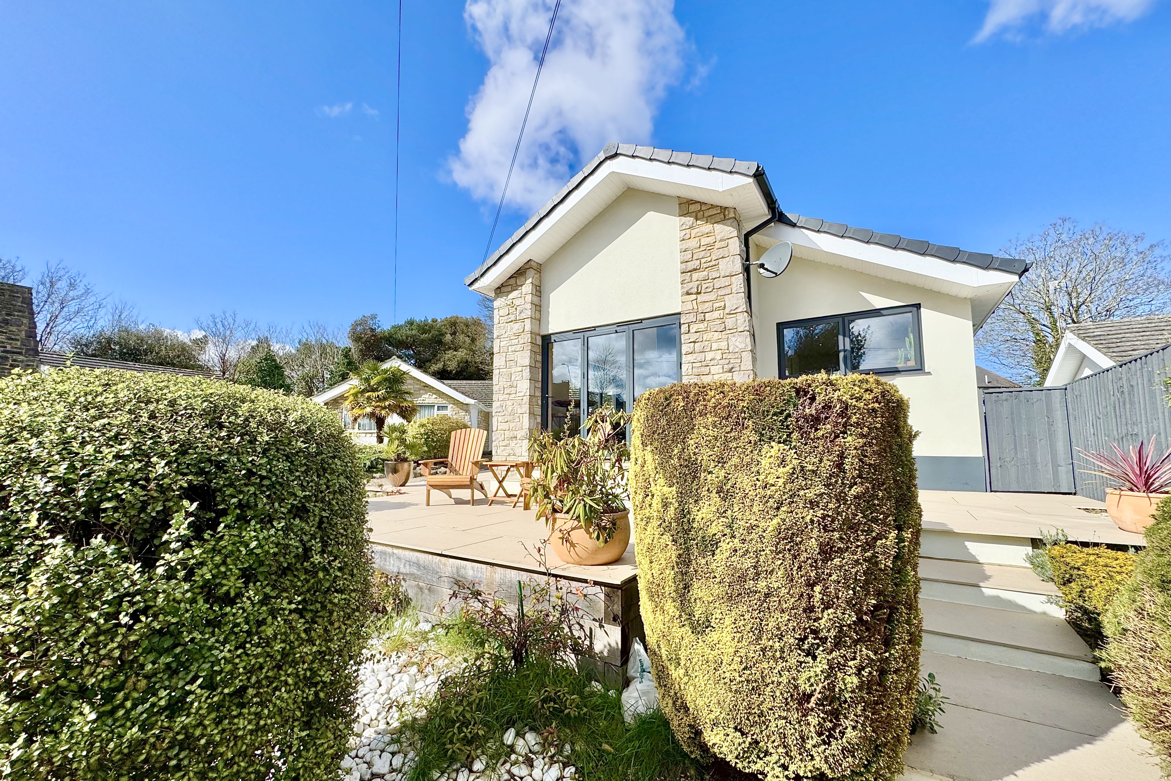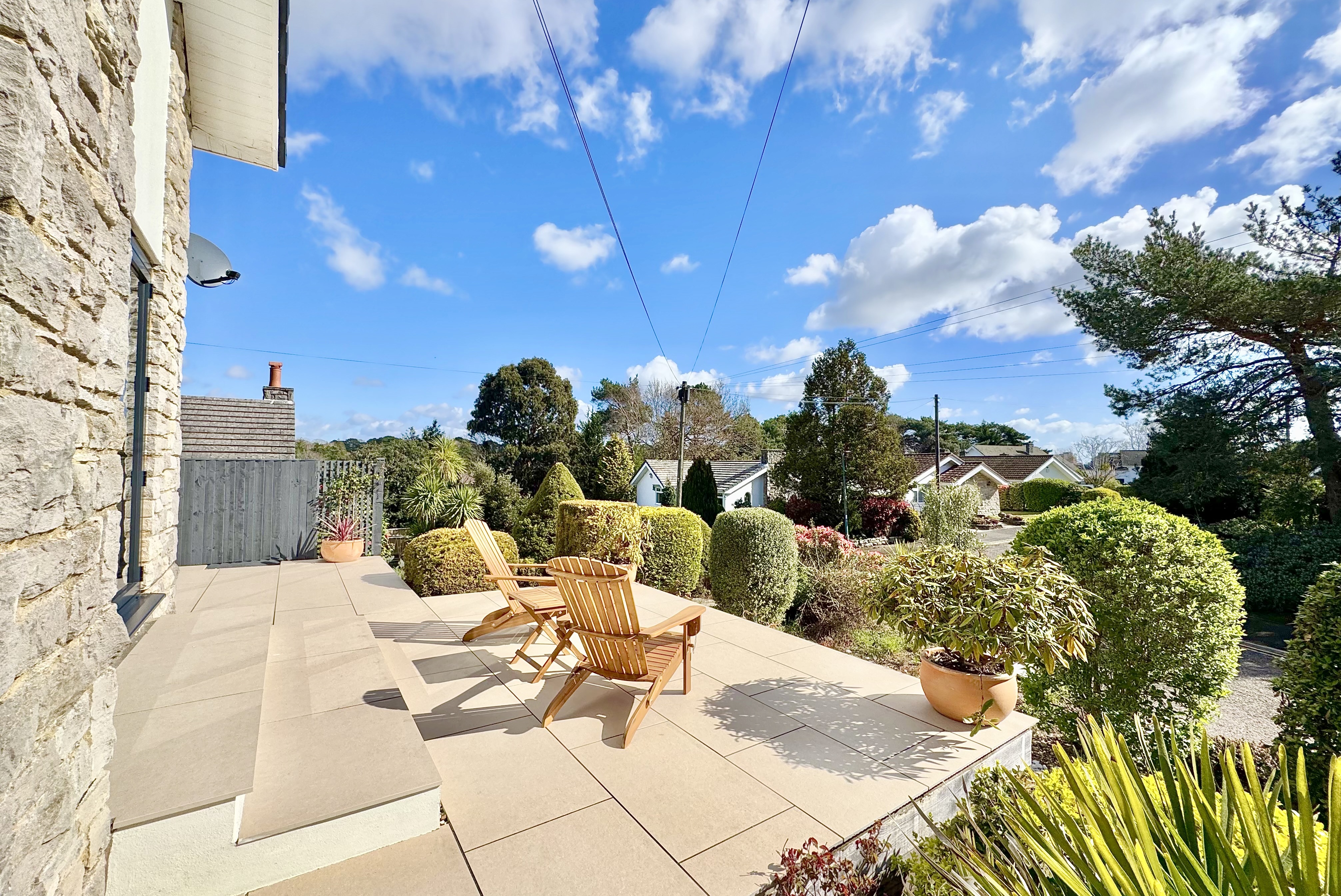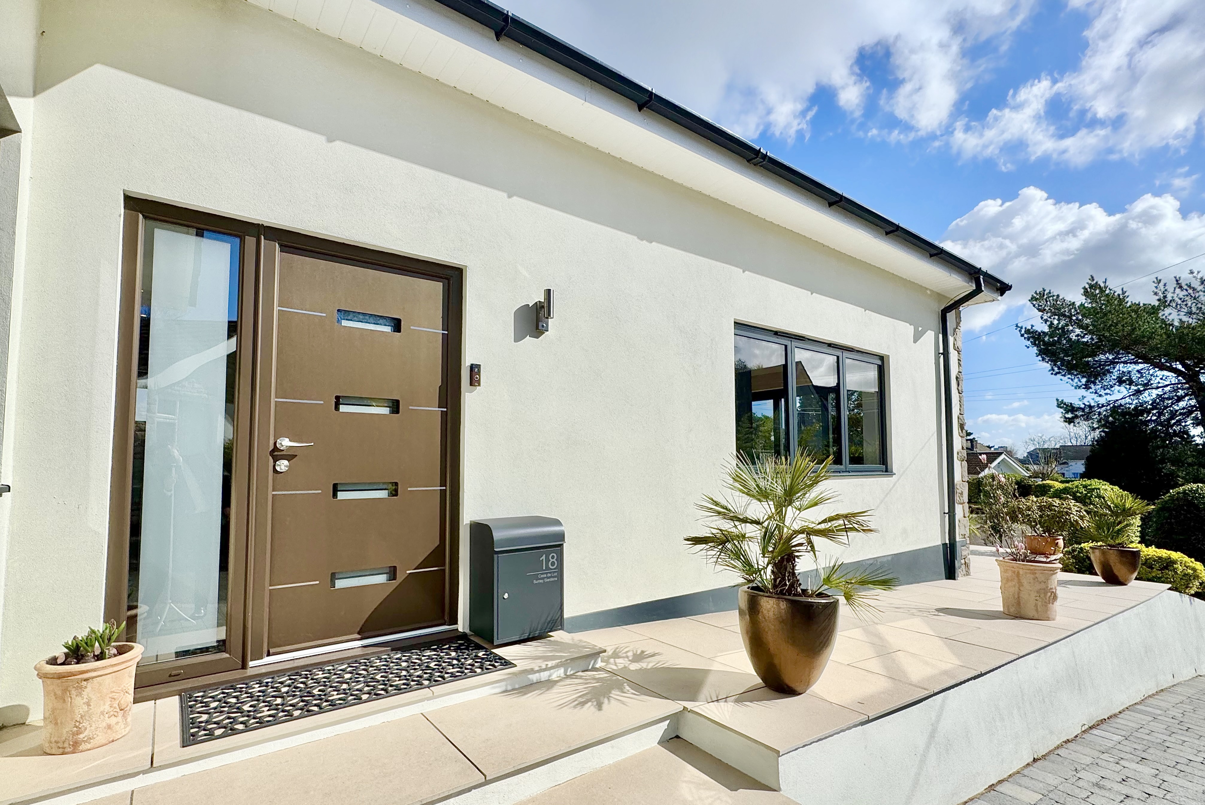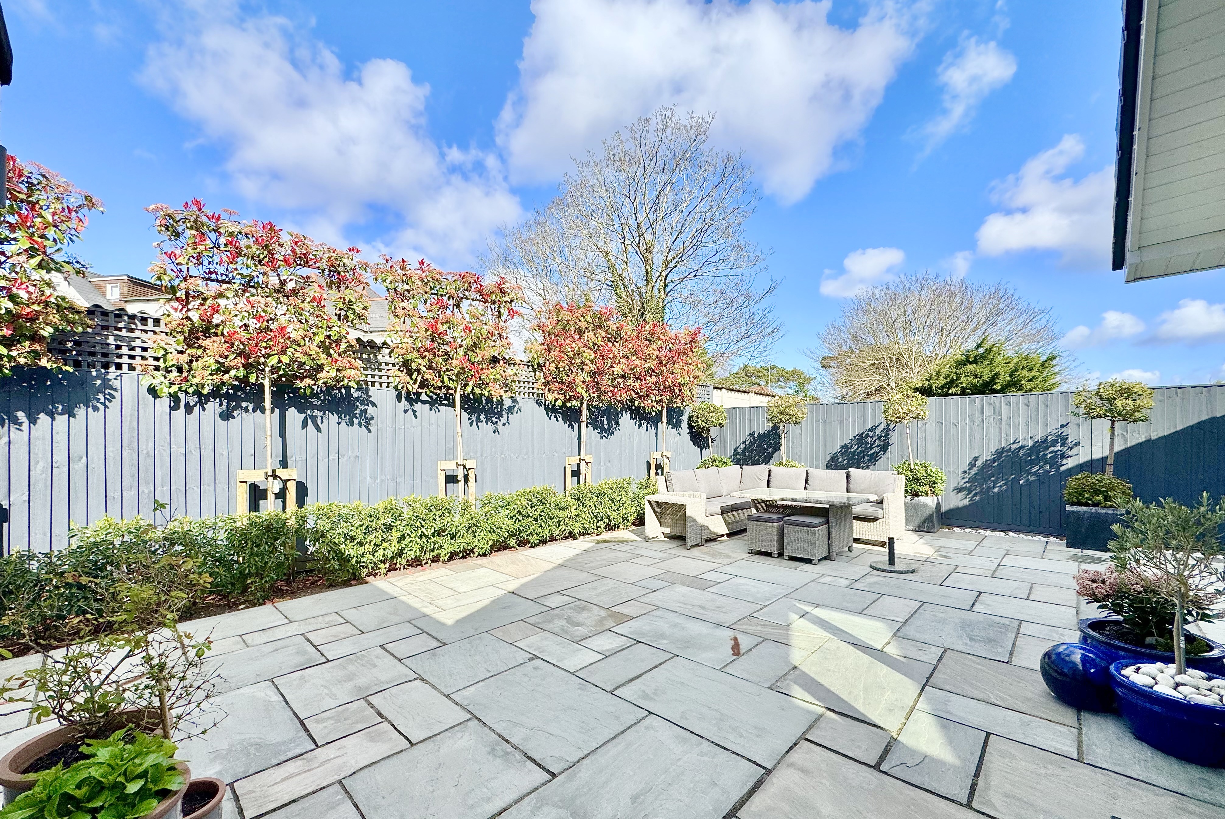 Externally, the property is superbly presented, with a newly installed tegula block paved driveway providing ample off-road parking and a striking contemporary Palladio entrance door with glazed side panel. The south-facing rear garden offers a private, low-maintenance space ideal for seating and entertaining, complemented by uplighters to illuminate the established planting including red robin hedging, a pear tree and an apple tree. Porcelain tiling extends across the front terrace and along both sides of the property, creating a cohesive and high-quality finish. A garage with a newly installed Garador provides excellent additional storage and utility space, with power, fitted shelving, space for appliances and direct access to the garden.