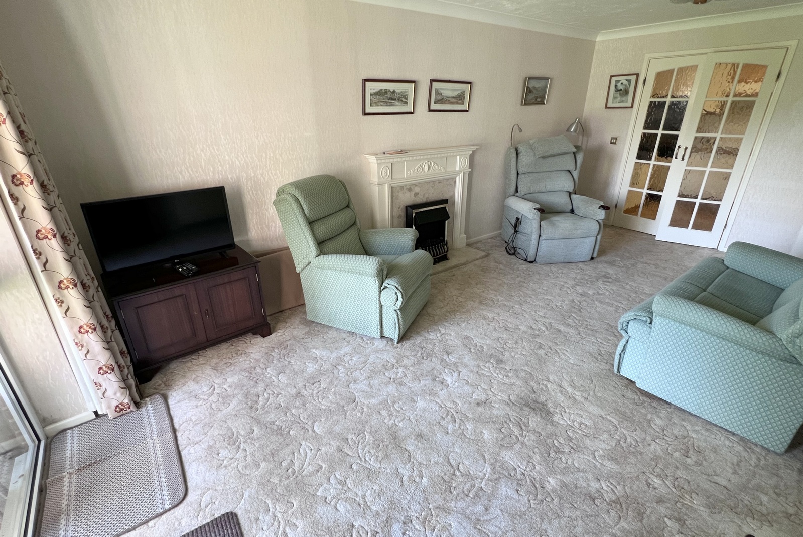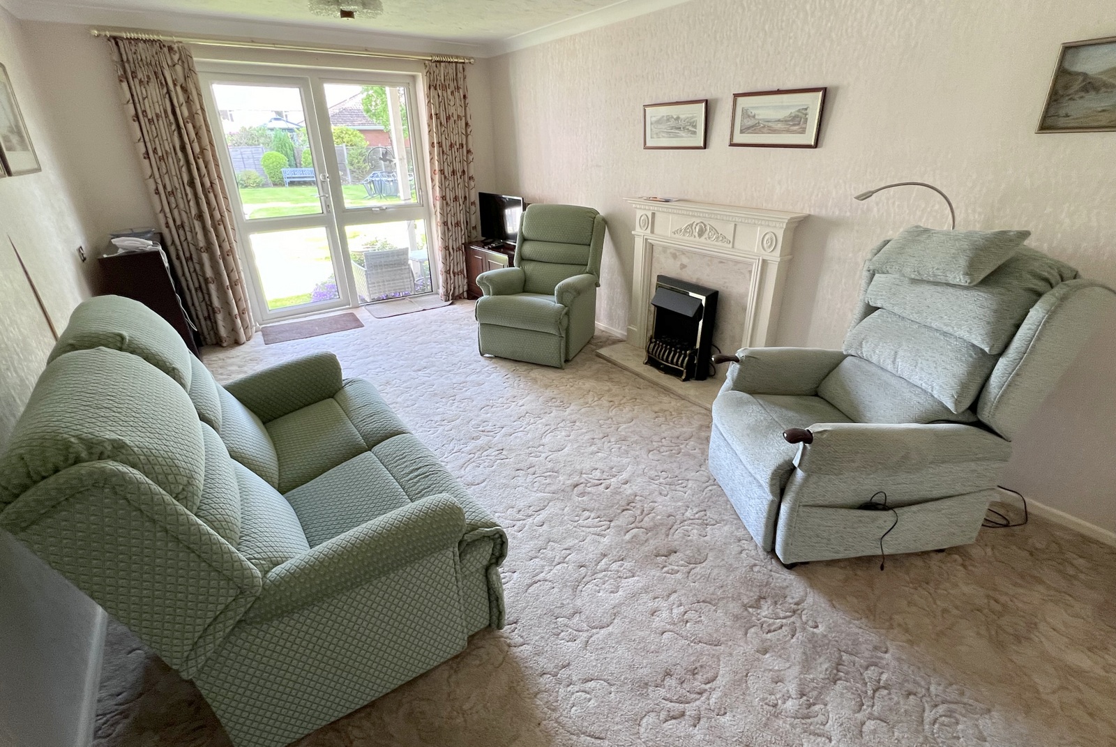 • Lounge/dining room spacious room with double glazed window and patio door, storage heater, electric fire doors to;