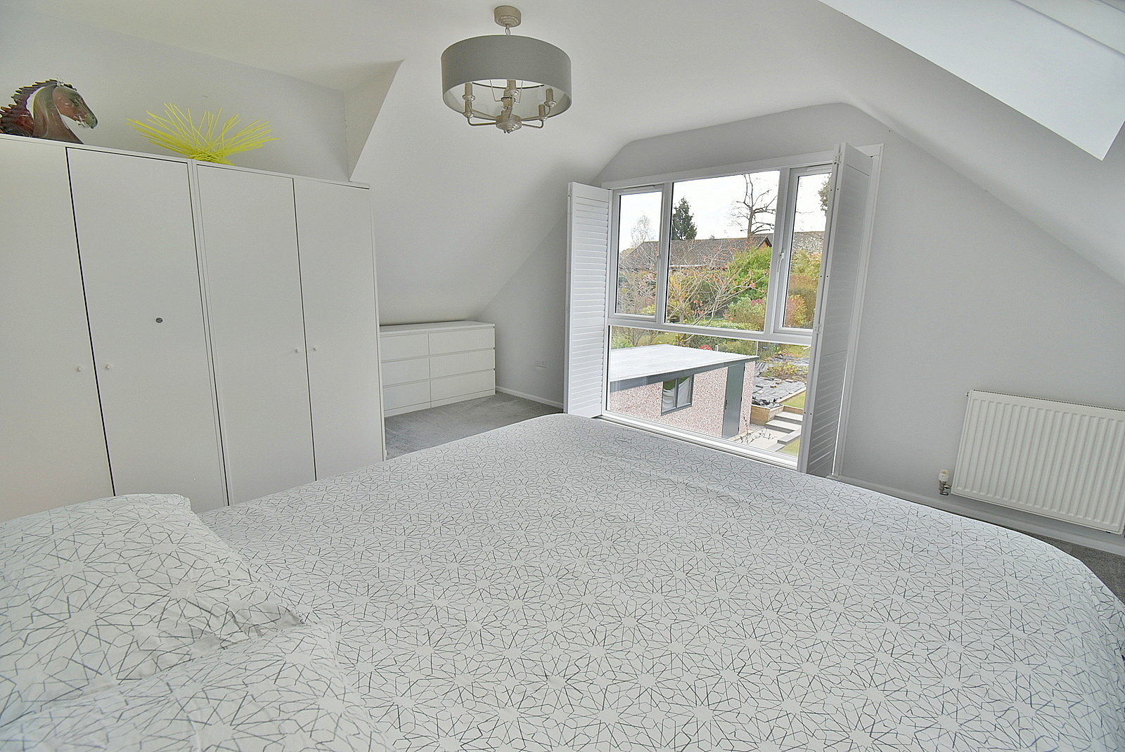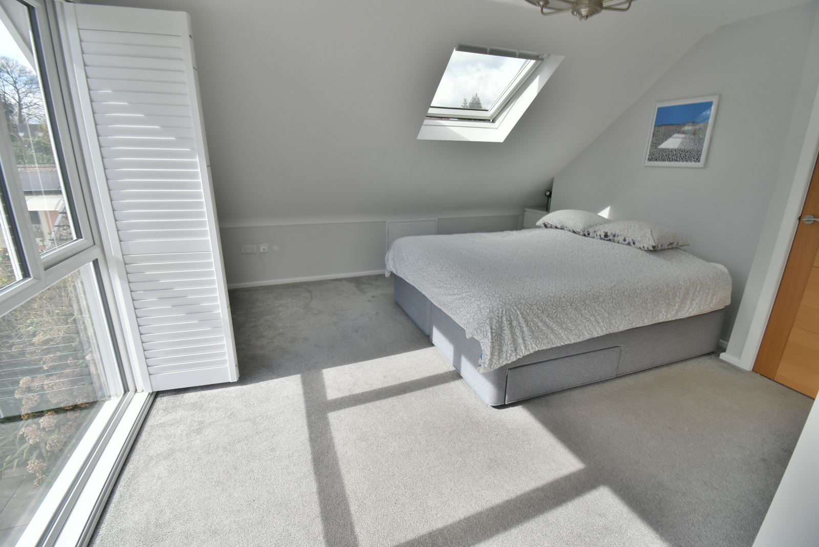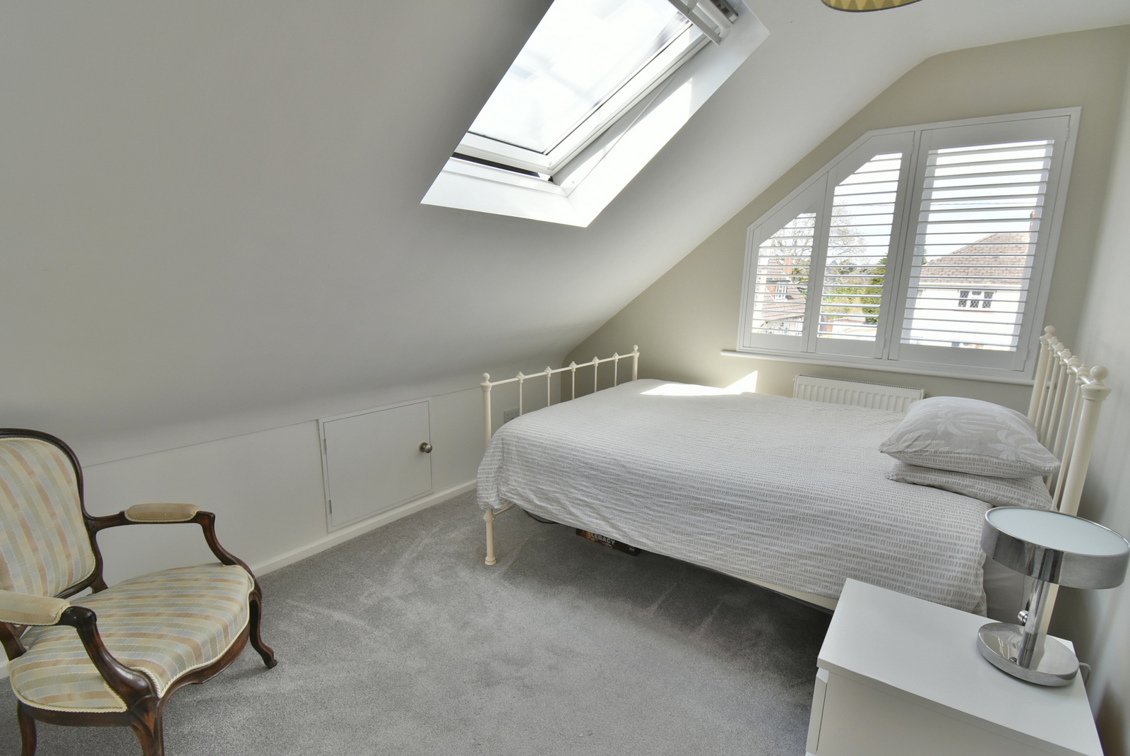 • Bedroom one is a spacious main bedroom with full height window overlooking the rear garden, fitted custom made wooden shutters, Velux window, generous eaves storage and ample space for wardrobes