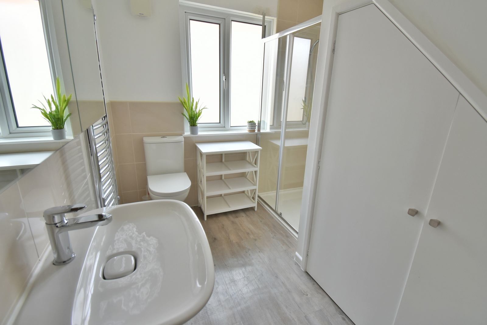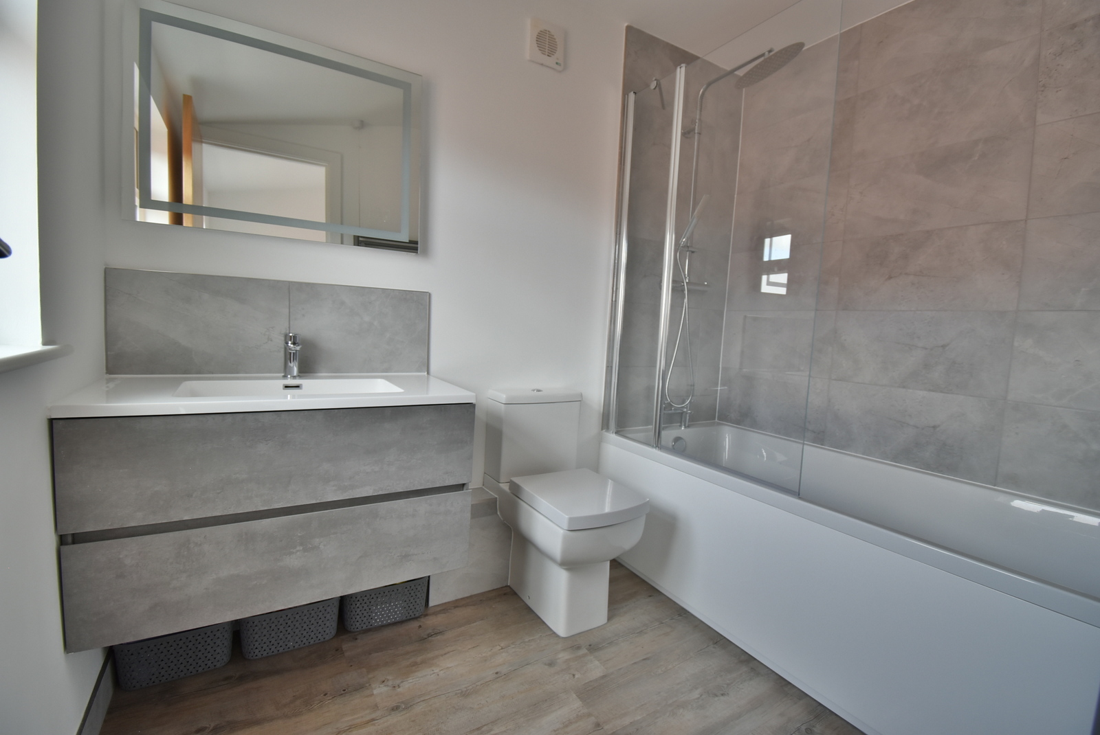 • Bathroom newly fitted in a luxury modern suite comprising a panelled bath with thermostatic rain head and hand held shower, glass screen, wall hung vanity unit with LED mirror, WC and heated towel rail