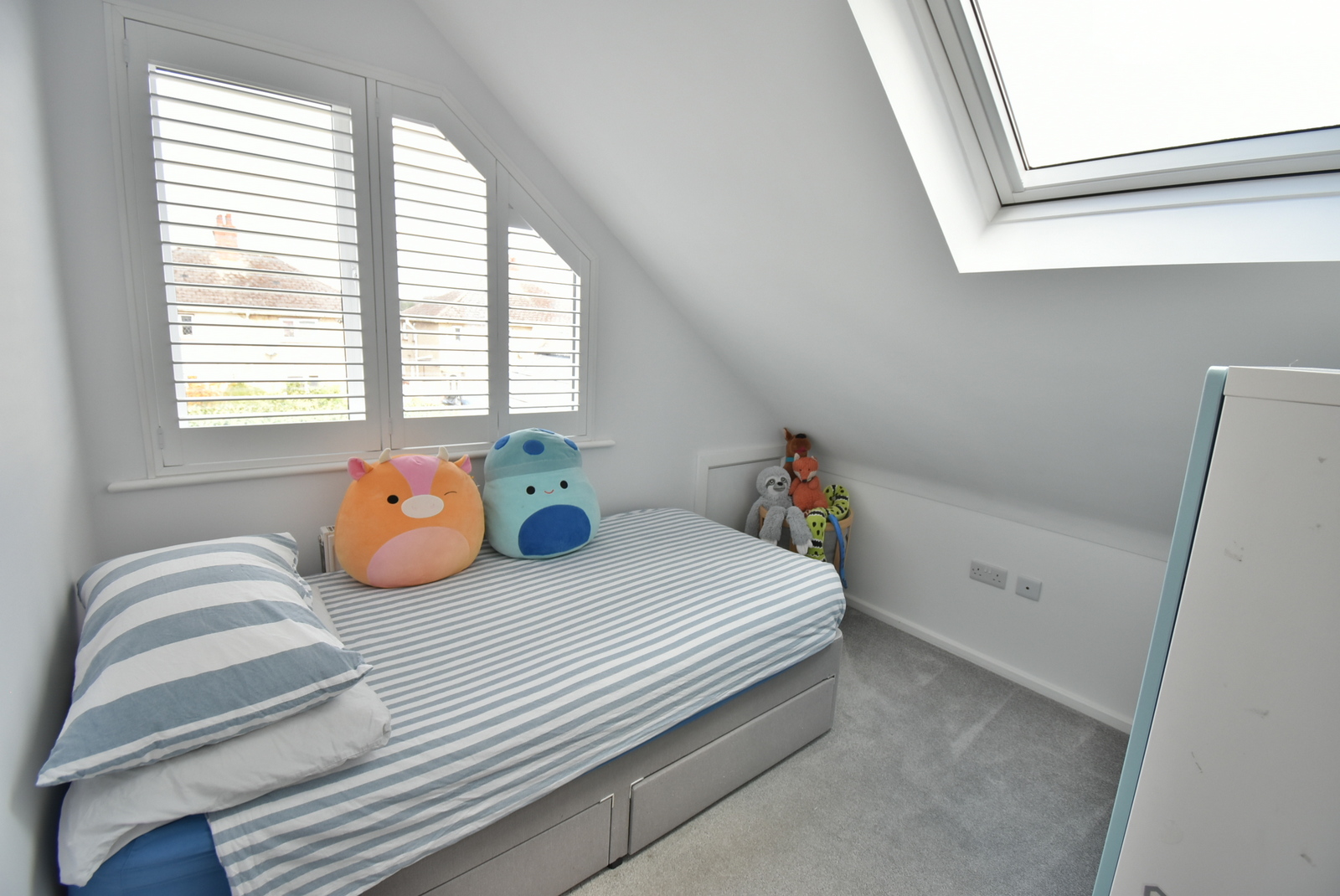 • Bedroom three is a single bedroom with front aspect, Velux window, custom wooden shutters and large eaves storage