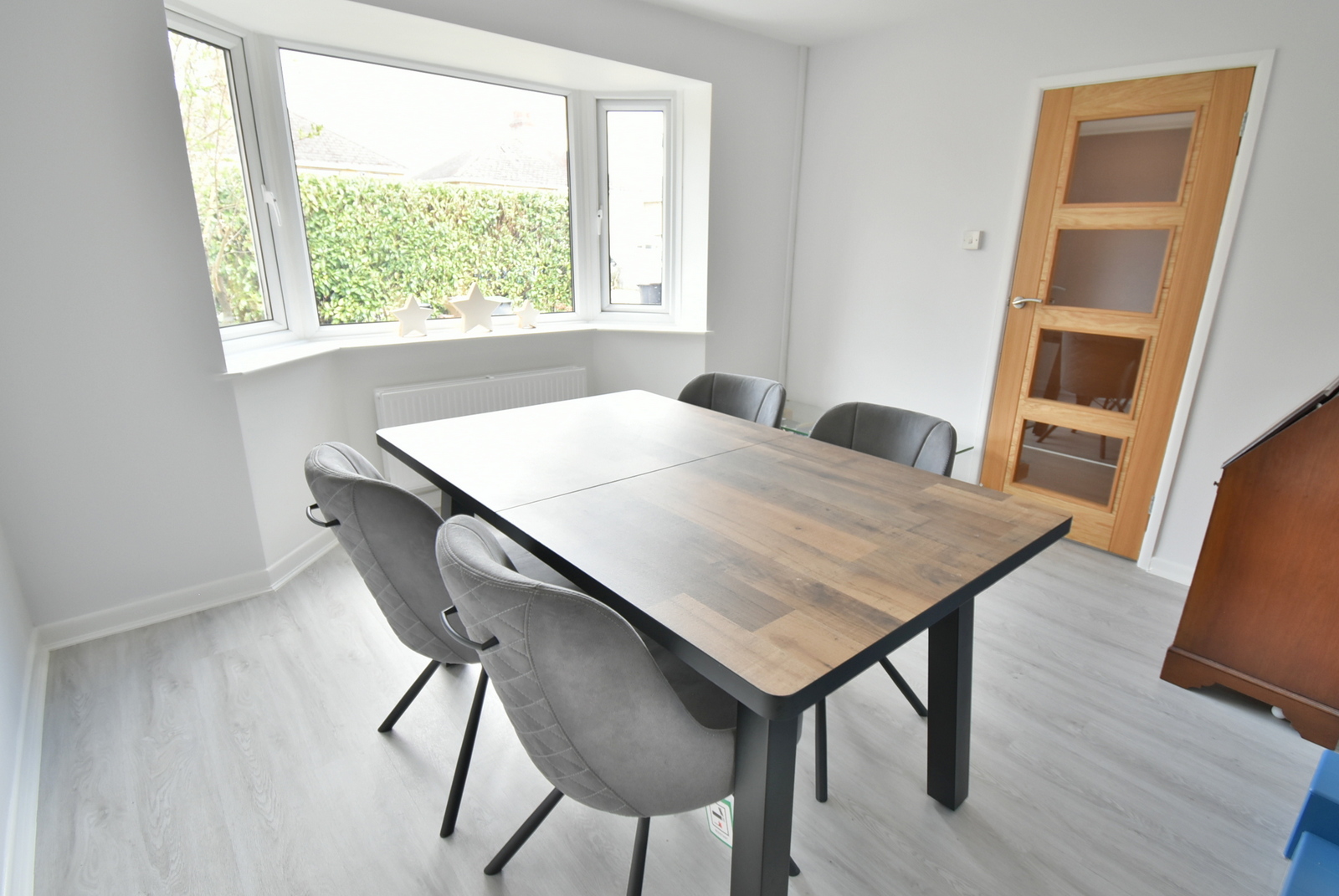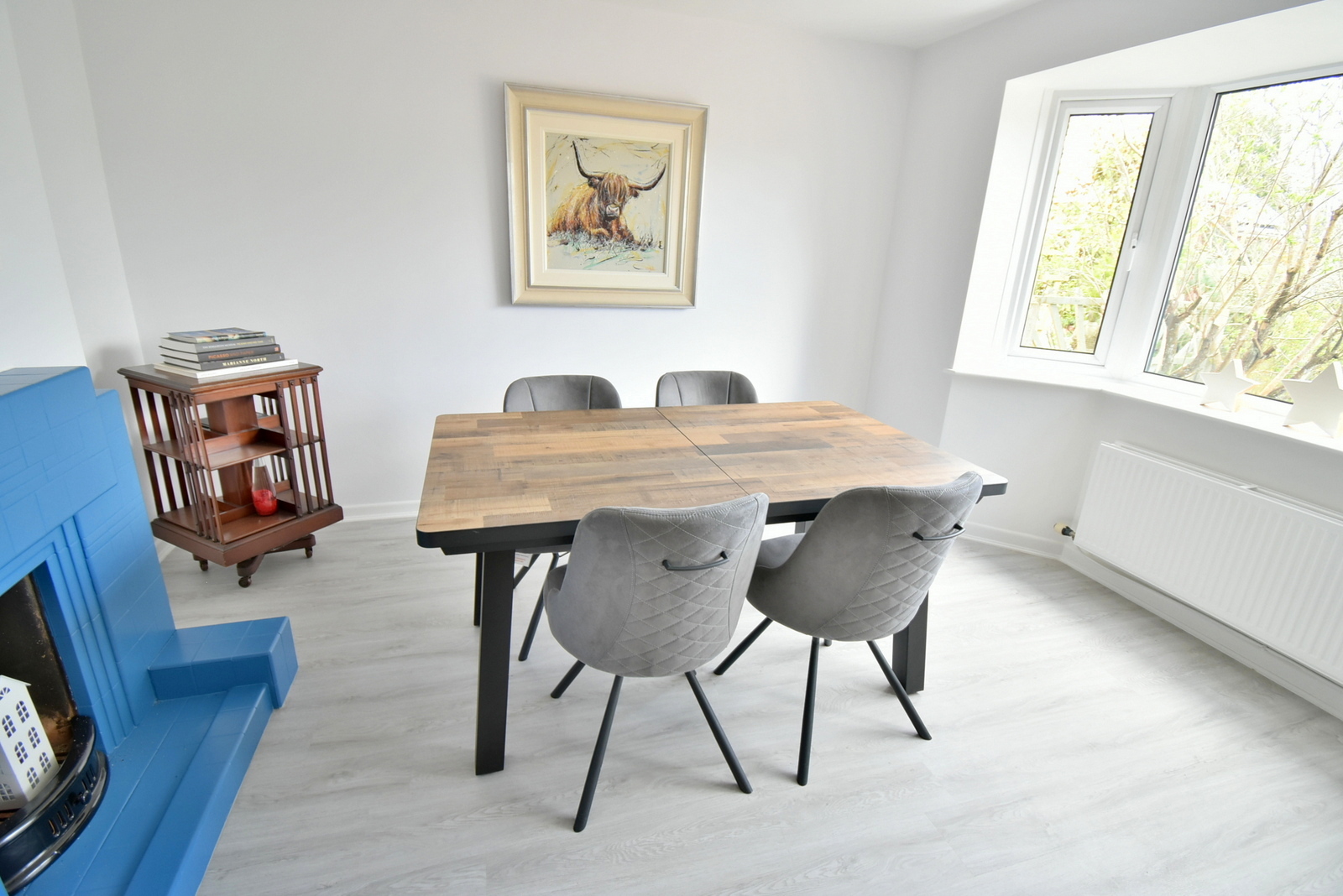 • Sitting room/dining room with bay window to the front aspect, feature open fireplace and new laminate flooring