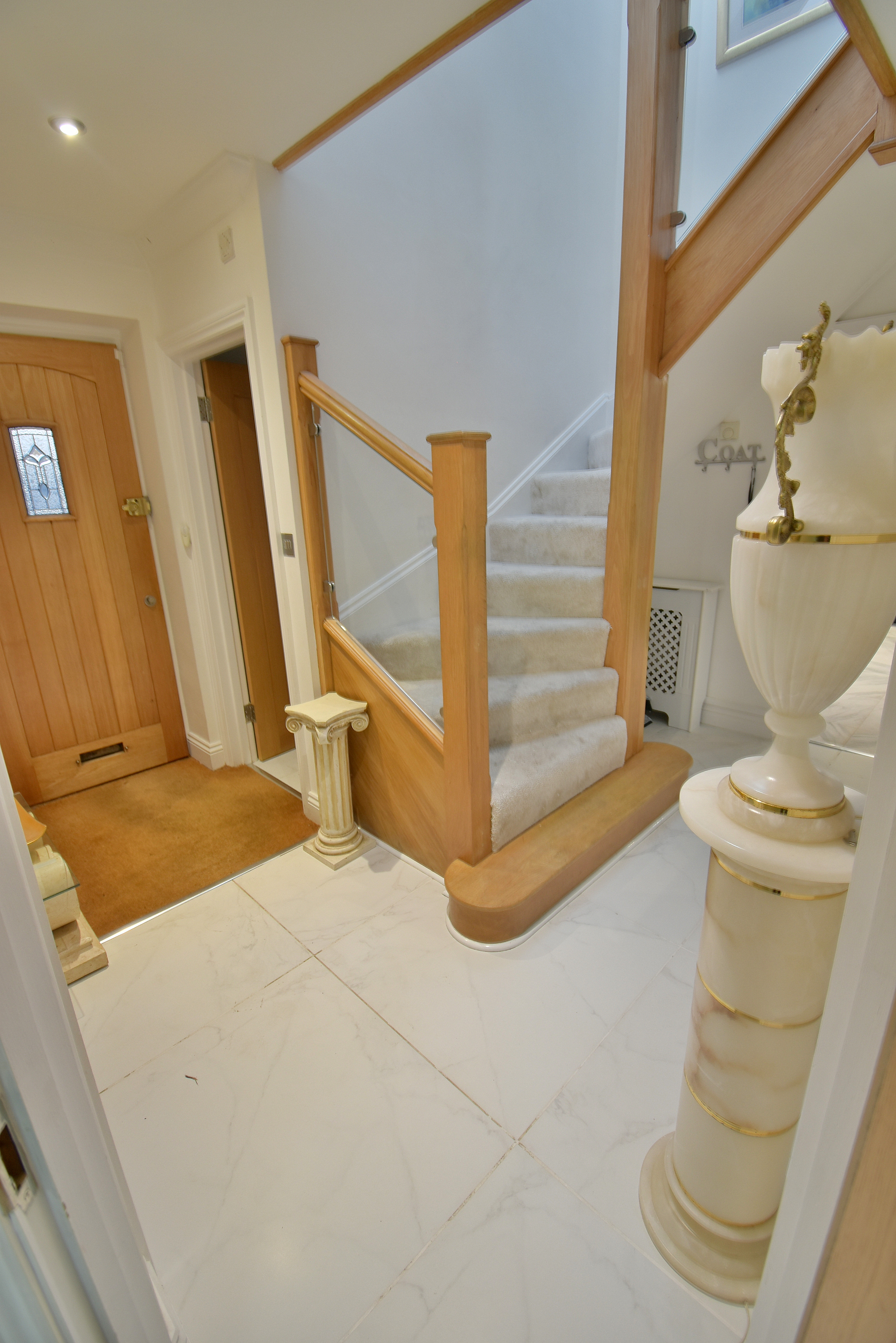 • Spacious entrance hall with oak staircase and glass balustrade creating an attractive feature and leading up to a galleried landing, porcelain tiled floor