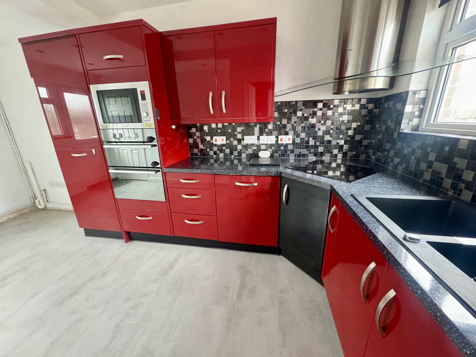 • Modern kitchen, fitted in a range of striking red high gloss units with black work tops over and fitted with integrated appliances to include induction hob, extractor, oven and separate grill, dishwasher and space for washing machine and fridge/freezer