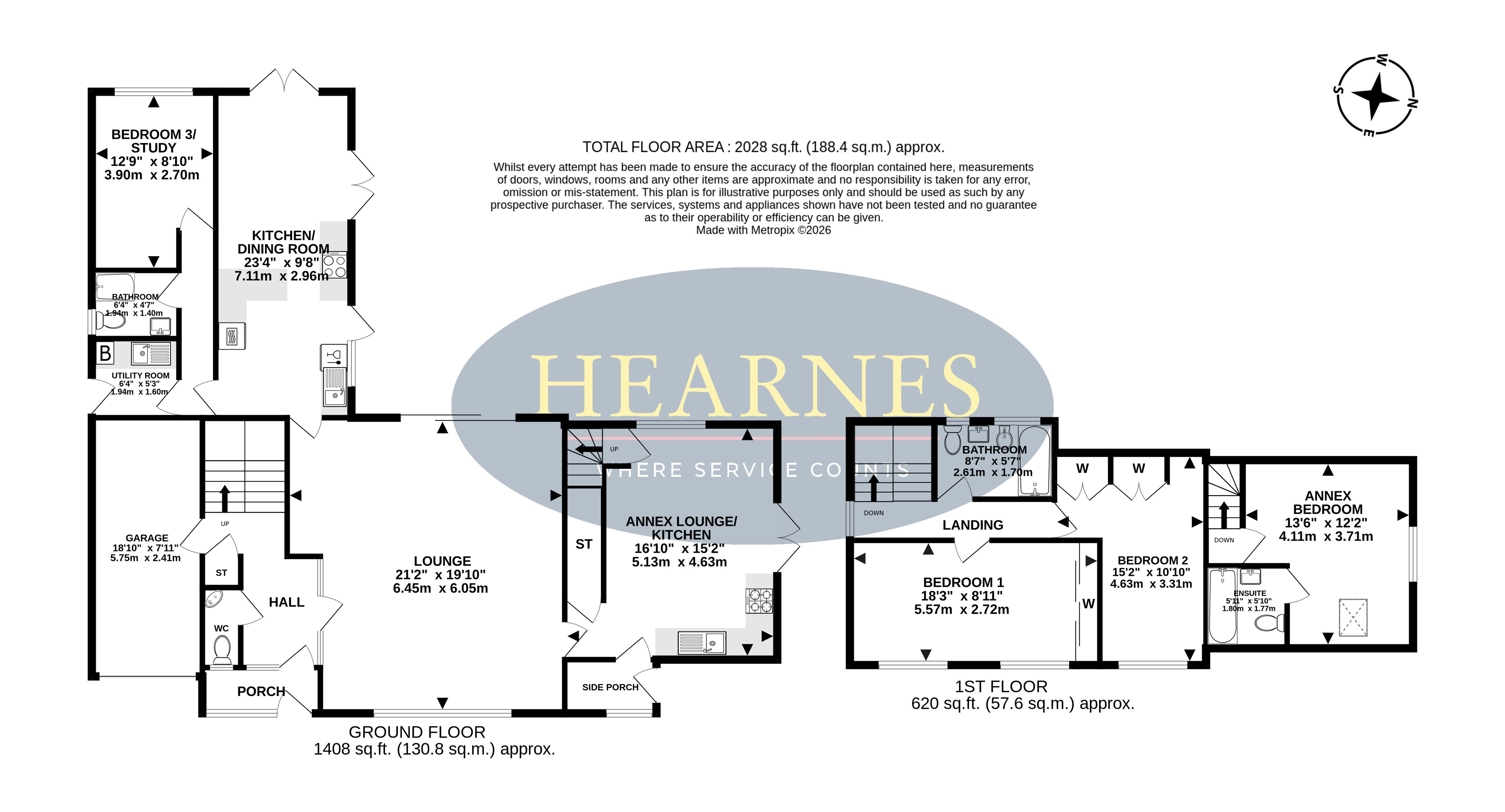 • Fully self-contained one bedroom, 2 storey annex with private entrance, lounge/kitchen/dining room and first floor bedroom with ensuite bathroom. This annex has its own private garden and could be used as an Air BnB or for a family member
