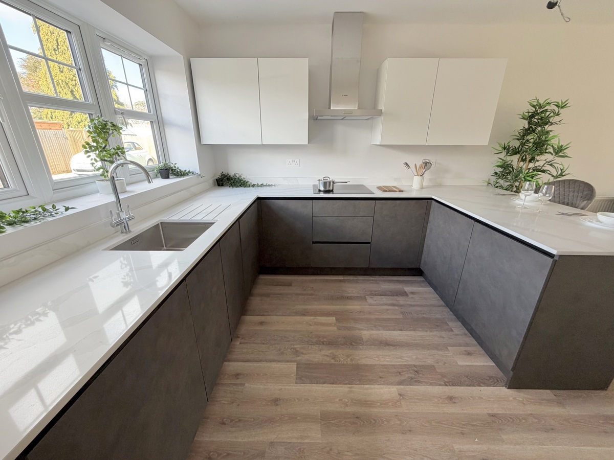 • Kitchen fitted in a range of contrasting anthracite grey and stone coloured handle less units with complimentary slim work tops over, extending to form a breakfast bar. High quality integrated appliances to include induction hob, oven, separate grill, extractor, dishwasher, fridge/freezer and washing